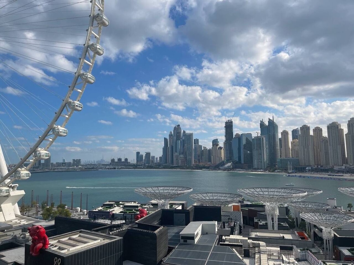 This amazing FULLY-EQUIPPED 2-bedroom apartment is in the heart of Bluewaters Island, most LUXURY and expensive area. It can comfortably accommodate 5 guests. Guests have access to the community area available for the residents only, children's PLAYGROUND, BBQ area, basketball COURT, infinity swimming POOL, GYM, and private parking. There is a variety of restaurants and cafes right across the street and EYE DUBAI, which offers breathtaking VIEWS. The grocery store is within a walking distance.