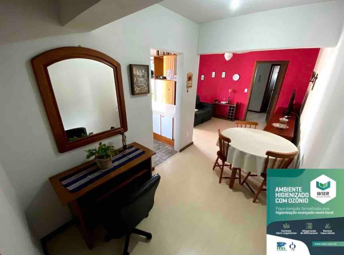 Retornando após um período fechado para melhorias. Apartamento aconchegante, com elevador, garagem privativa, porteiro das 7h da manhã às 19h, confortável e bem arejado. Fica à disposição do hospede: Eletro-doméstico, tv, internet banda larga com WiFi exclusivo do apartamento, ar-condicionado na suíte e ventilador na sala. Fique tranquilo e seguro em nosso espaço, utilizamos o mais moderno método de sanitização com ozônio, a cada troca de hóspedes todos os ambientes passam por sanitização!