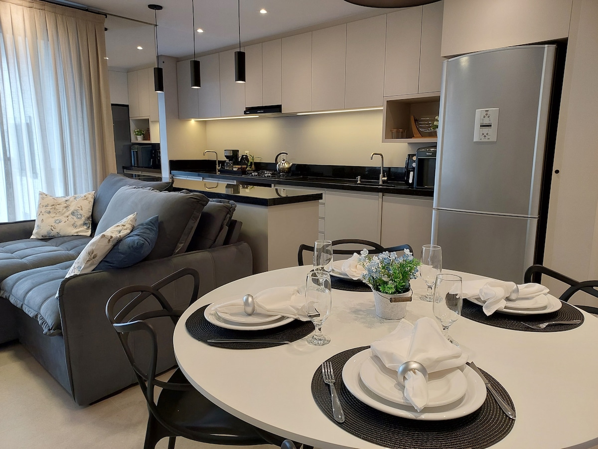 Beautiful studio apartment with garage, in the center of Blumenau, near everything! Building has a gym and an incredible rooftop pool. The apartment is complete and very stylish. Double bed, sheets, covers, pillows, bath towels, AC. Full kitchen with refrigerator, microwave and tableware for 2. Laundry with washer+dryer machine, iron table and iron.