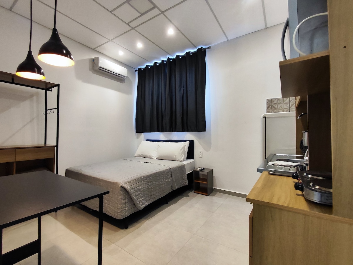 Stúdio completo. É um ambiente clean, bem iluminado, arejado, agradavel e aconchegante.