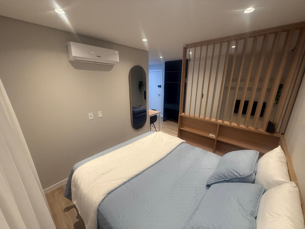 Stylish brand new studio mere steps to Villa Germanica & Oktoberfest. Enjoy sweeping views throughout the ap and from its private bathtub. Recently constructed high rise is walkable and central to FURB, Parque Ramiro Rudiger, Oktoberfest and much more Nearby are countless markets, restaurants, cafes and bars all walkable. Uber arrives within 2-3 minutes Easily walkable is António da Veiga street with bustling nightlife Building has laundry room, gym and an extraordinary rooftop infinity pool
