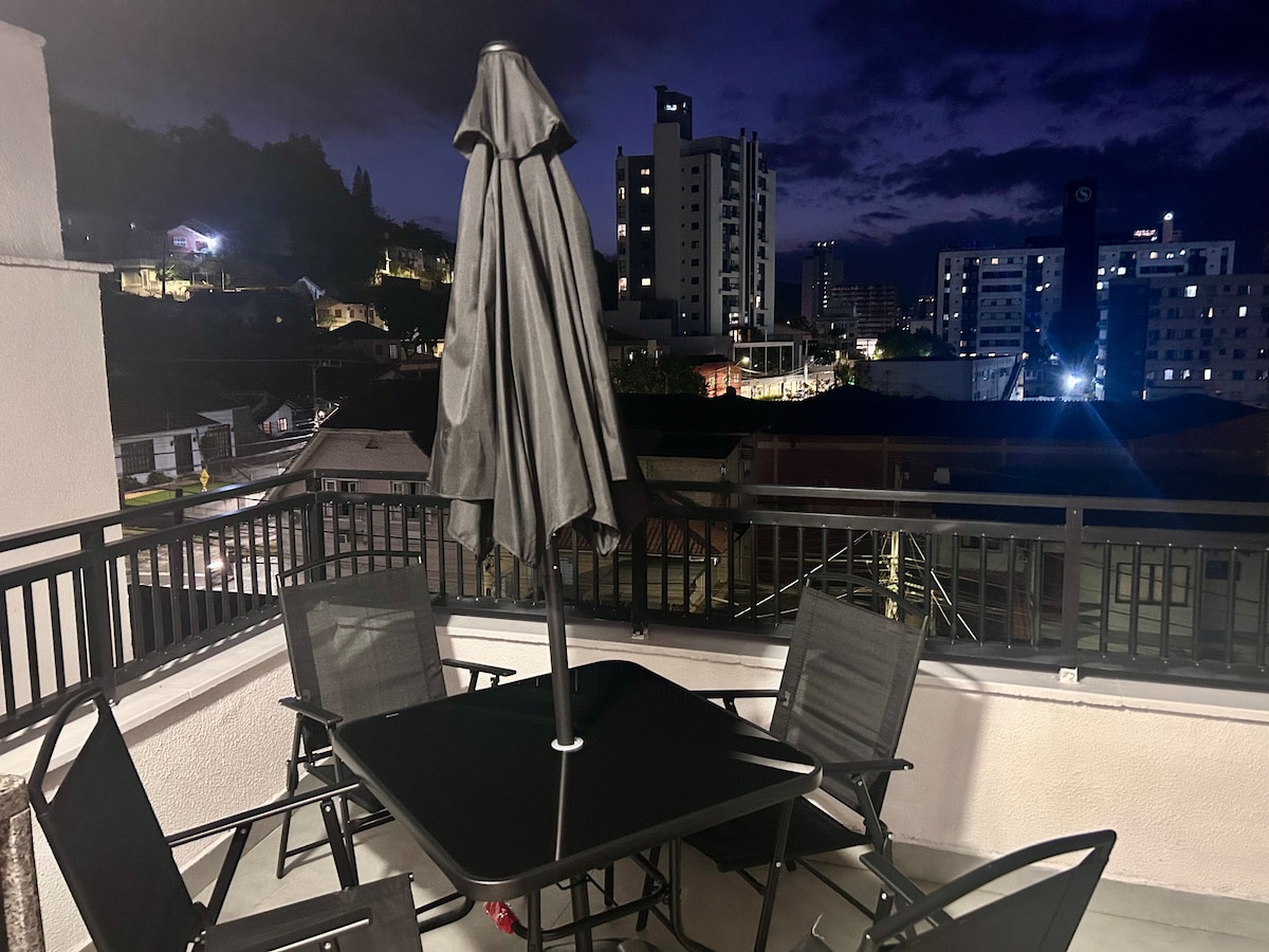 Apto com amplo terraço | 2 Quartos com Ar split | 2 banheiros | Pet Friendly | Elevador | Garagem privativa Localizado na Rua João Pessoa, a cerca de 450 metros da Vila Germânica! - Cozinha equipada - Toalhas e roupas de cama na acomodação - Até 4 hóspedes Nas proximidades, você também encontra: • Restaurantes, pizzarias, lanchonetes, sorveterias e McDonald’s • Parque Ramiro • Supermercados (Angeloni ~ 100 metros) • Farmácia e lavanderia (no Angeloni)