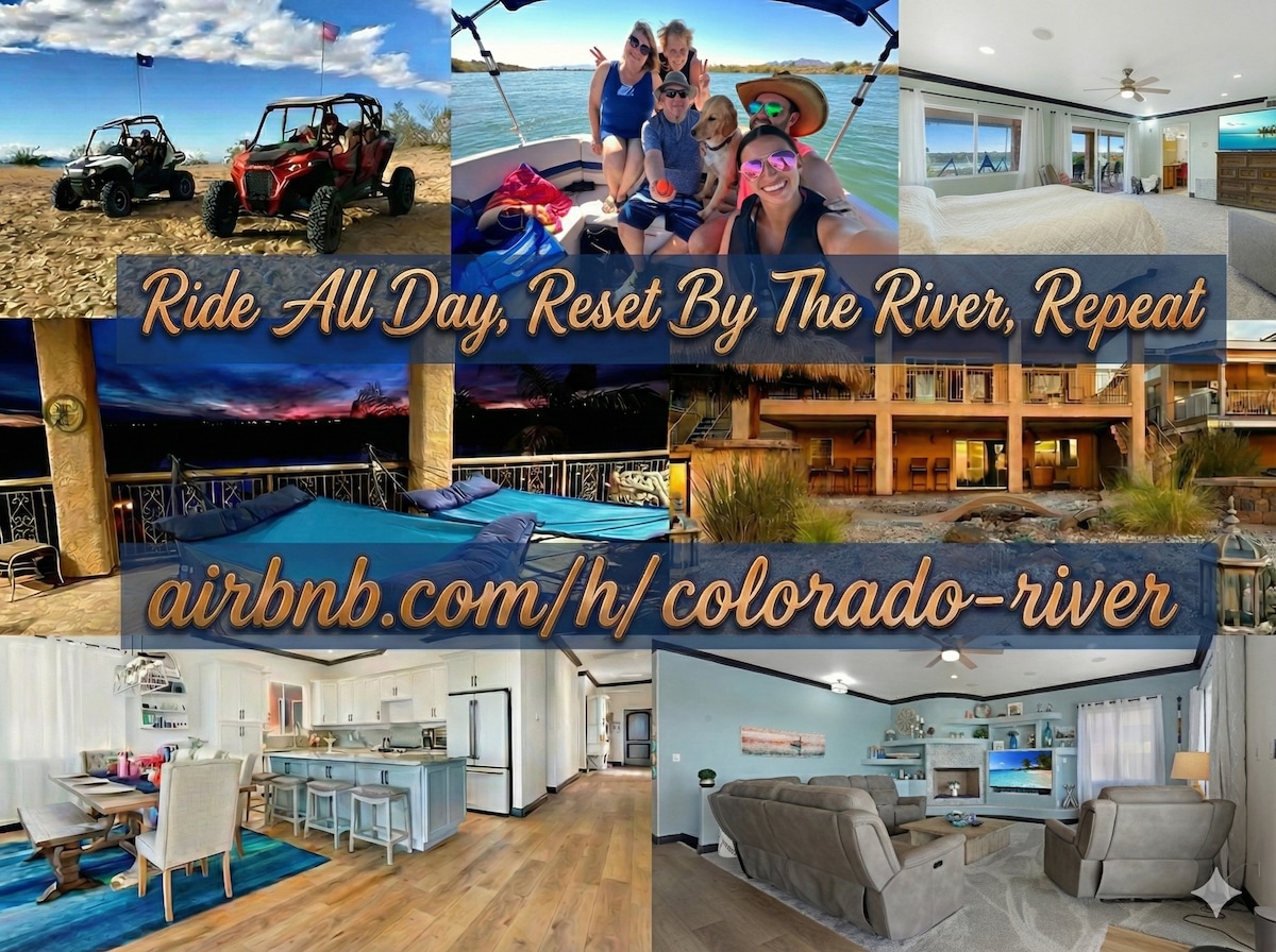 Hidden Beaches Resort - This well sought after resort is just about 6 miles from the 10 freeway on the California side of the river, and offers a private Dock, Boat Launch, and beaches with tables in the water with umbrellas. Also a restaurant with outdoor seating and convenience store. The home is in the back of the resort for peaceful privacy, and sleeps up to 10 people. The water is beautiful and clear. And fishing is great. Bring the whole family to this great place with lots of room for fun