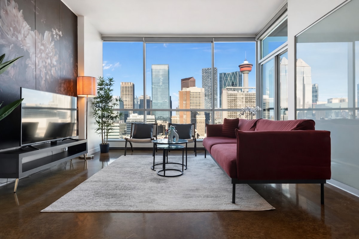 Live life in style at this amazing 2-bed condo with breathtaking downtown skyline views! Enjoy unique features like floor-to-ceiling windows, polished concrete floors, and stylish furnishings. Marvel at sunsets over the Rocky Mountains from your living room! Walk to Calgary's hottest restaurants, nightlife, and events. Located near Proof, Ten Foot Henry, Native Tongues, 17th Ave SW, and the Calgary Saddledome & Stampede Grounds! Don't miss this opportunity to stay at Calgary's finest!