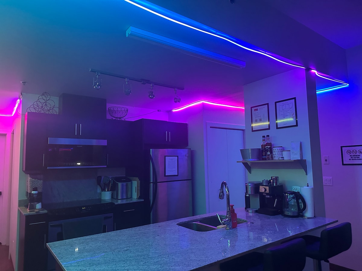 Enjoy a colorful neon light experience all night long at this centrally located place. 1 king bed, 2 bathroom, corner unit, with gorgeous views of Stampede & Calgary Tower, framed by 45 feet of commercial-grade floor-to-ceiling windows. Walking distance to Calgary’s finest restaurants, shopping, bus and trains. Incudes: • Internet 300 • Underground parking • King bed • In suit Laundry • Coffee, espresso & tea • Cereal & Oatmeal • Treadmill • 65" SmartTV: -Netflix -Prime -Premium YouTube Music
