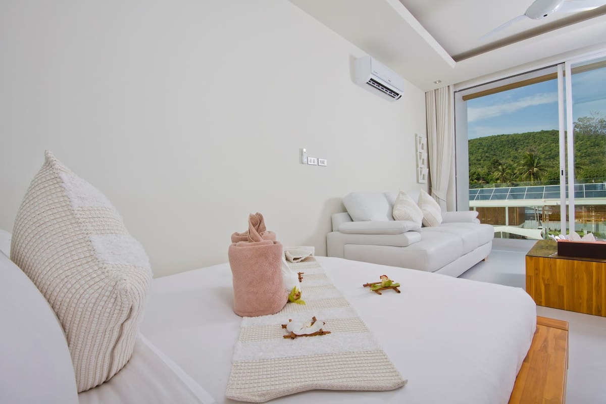 Freshly renovated 55sqm suite in Bangrak! 10 min walk to Fisherman’s Village. 3km to Airport (NO noise!). ✨ Sleep: New Queen mattress (180x200) + leather sofa bed (max 3 guests). Hotel cotton linens. 🚿 Premium Tech: Dishwasher, European front-load washer, grill-microwave, new tropical rain shower, private fast Wi-Fi. 🤫 Comfort: New soundproof windows (silence guaranteed!) & 2 ACs. Mountain view balcony, pool & security. Baby cot avail. Flexible check-in/out! Nr trendy Beach Clubs!