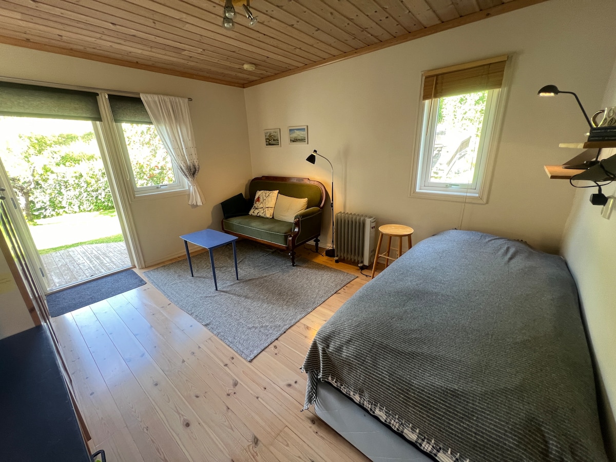 Vi leier ut bryggerhuset/eldhuset på gården med stor plen til deres disposisjon. Her kan barn leke, sparke fotball m.m. Huset har kjøkken, stue, badstue og bad i første etasje. I andre etasje er det to soverom der det er plass til seks personer totalt. Det første soverommet har to enkeltsenger. Dette soverommet må man gå gjennom for å kommet til det andre, som inneholder en dobbeltseng, og to enkle senger. Huset ligger landlig til. Muligheter for mange aktiviteter i nærheten !!