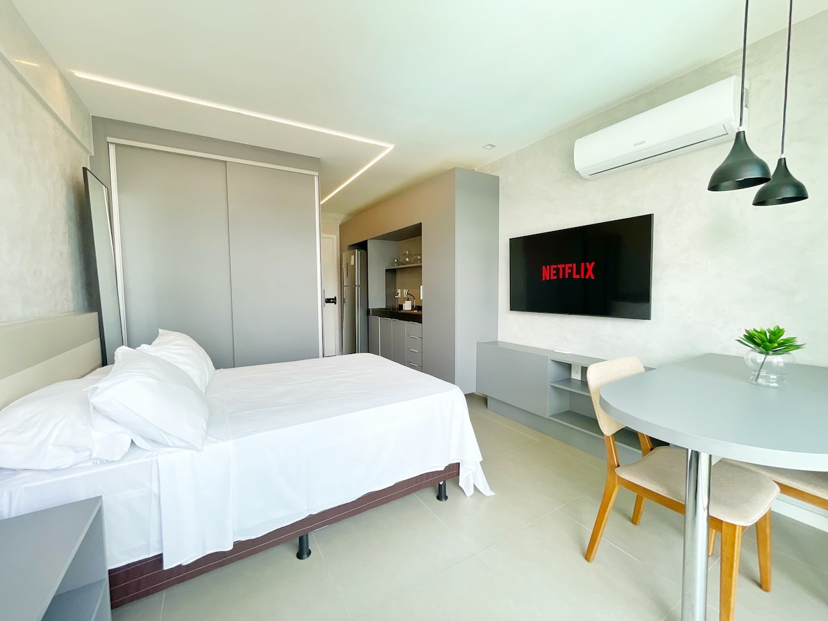 Studio em Boa Viagem com linda vista do mar, aconchegante e bem localizado: 🏖️12 minutos de caminhada da melhor área da praia de Boa Viagem; ✈️ 15 minutos do aeroporto; 🛍️ 8 minutos do Shopping Recife; 📍 Próximo de mercado, padaria, restaurantes e bares. Ao lado da Via Mangue que é uma das principais vias de acesso para a Zona Norte, Recife Antigo e Olinda. O prédio possui portaria 24h, Mini Mercado, lavanderia inteligente e piscina na cobertura com vista linda. Disponibilizamos garagem.