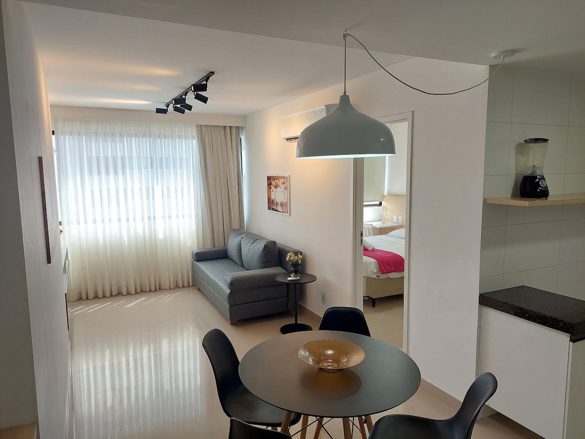 O apartamento é cômodo, pequeno, limpo, arejado. Da janela se vê o mar. Sala com cozinha americana, quarto e banheiro . Geladeira, cooktop, micro ondas, ar condicionado de janela, uma escrivaninha no quarto, TV smart no quarto, TV na sala, alguns utensilhos de cozinha. cama de casal , armar cama de campanha solteiro (3pessoa) Recepção 24h e manobrista incluso Hóspedes terão acesso o apto inteiro . O Flat possui piscina. Não aceitamos visitas e nem pets Será uma satisfação em receber vc!🌻