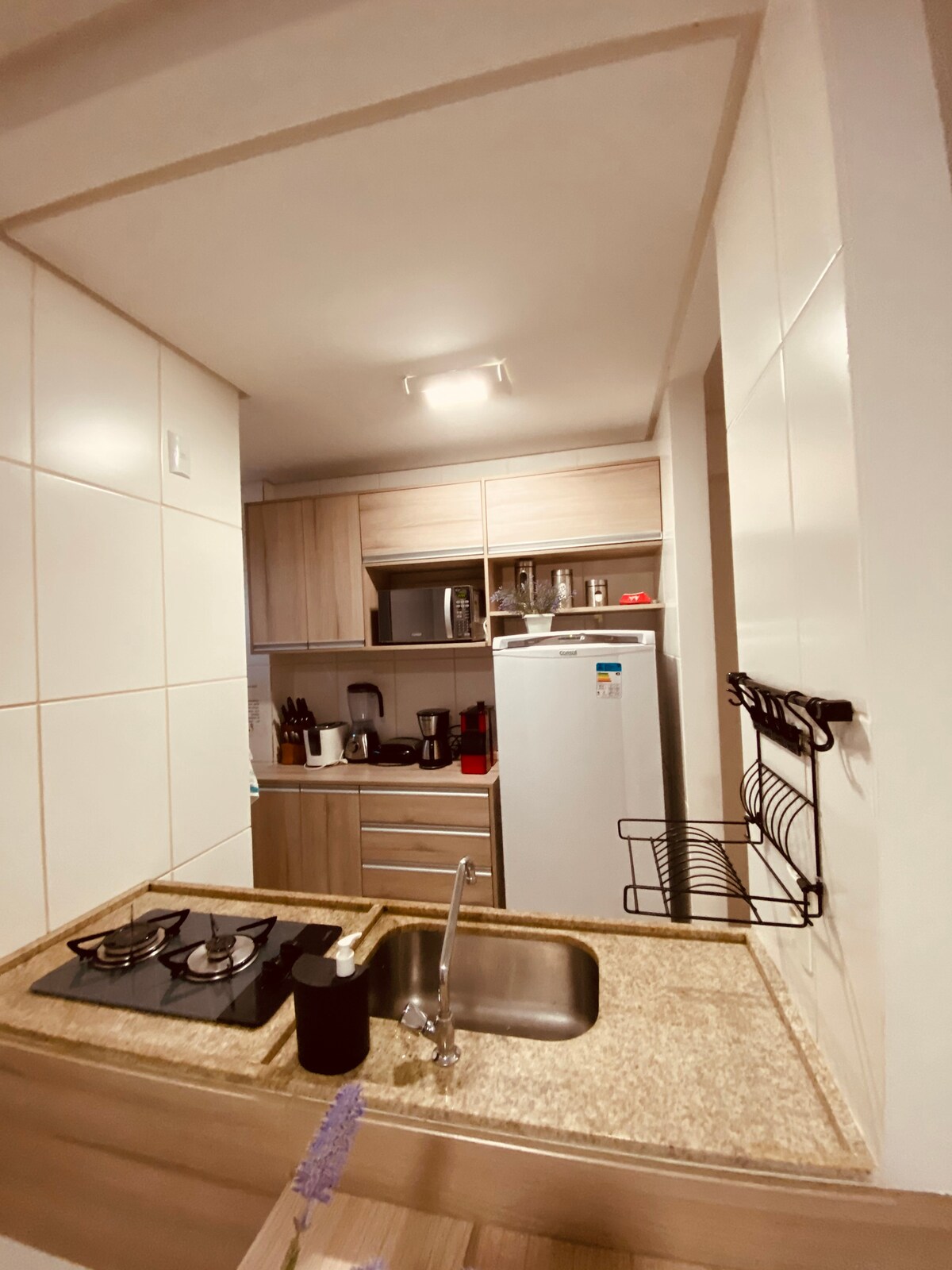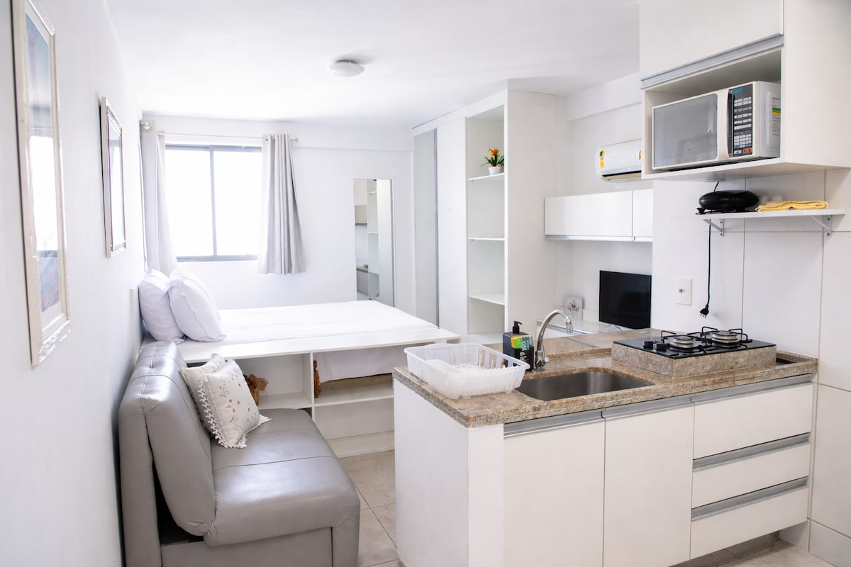 Você vai se sentir em casa, nesse aconchegante flat tipo estúdio, mobiliado com TV Smart, Ar-condicionado Split, geladeira, cooktop, microondas, sanduicheira, cafeteira,liquidificador, secador de cabelos, ferro de passar. Conta com uma cama de casal, mesa, cadeiras e utensílios para cama, mesa e banho. Você fará self check in se identificando na portaria e tendo acesso ao ap através de senha fornecida pela anfitriã. Dispomos de porteiros 24h que facilita o check in e check out.