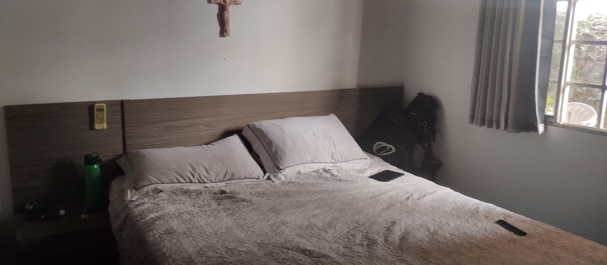 lugar espaçoso, independente,sem contato visual com vizinhos,07km do centro, tranquilo,simples,limpo, bem localizado, a 80 m da praça com quadras de esporte ,academia,sorveteria ,barzinho,restaurante ,sopas,lanchonete ,mercado,farmácia,igrejas,posto de saúde…com uma cama de casal,uma cama de solteiro e um colchão de solteiro