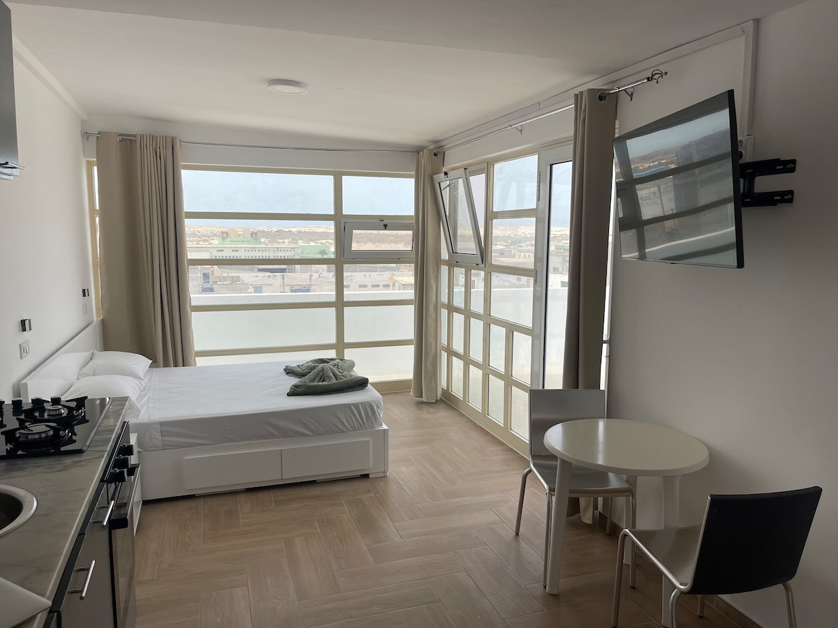 Localizado a 200 metros do centro de Sal Rei, 300 metros da praia de diante, 400 metros da praia de Cabral e 650 metros da praia de Estoril o apartamento oferece a localização perfeita para quem quer explorar as lindas praias de Sal-Rei e ter fácil acesso a mercados e restaurantes. O apartamento é moderno, bem equipado, com cômodos amplos e decoração requintada com uma deslumbrante vista para o ilhéu Sal Rei, as praias Estoril e Chaves. Quarto suite com closet e varanda vista para o mar.