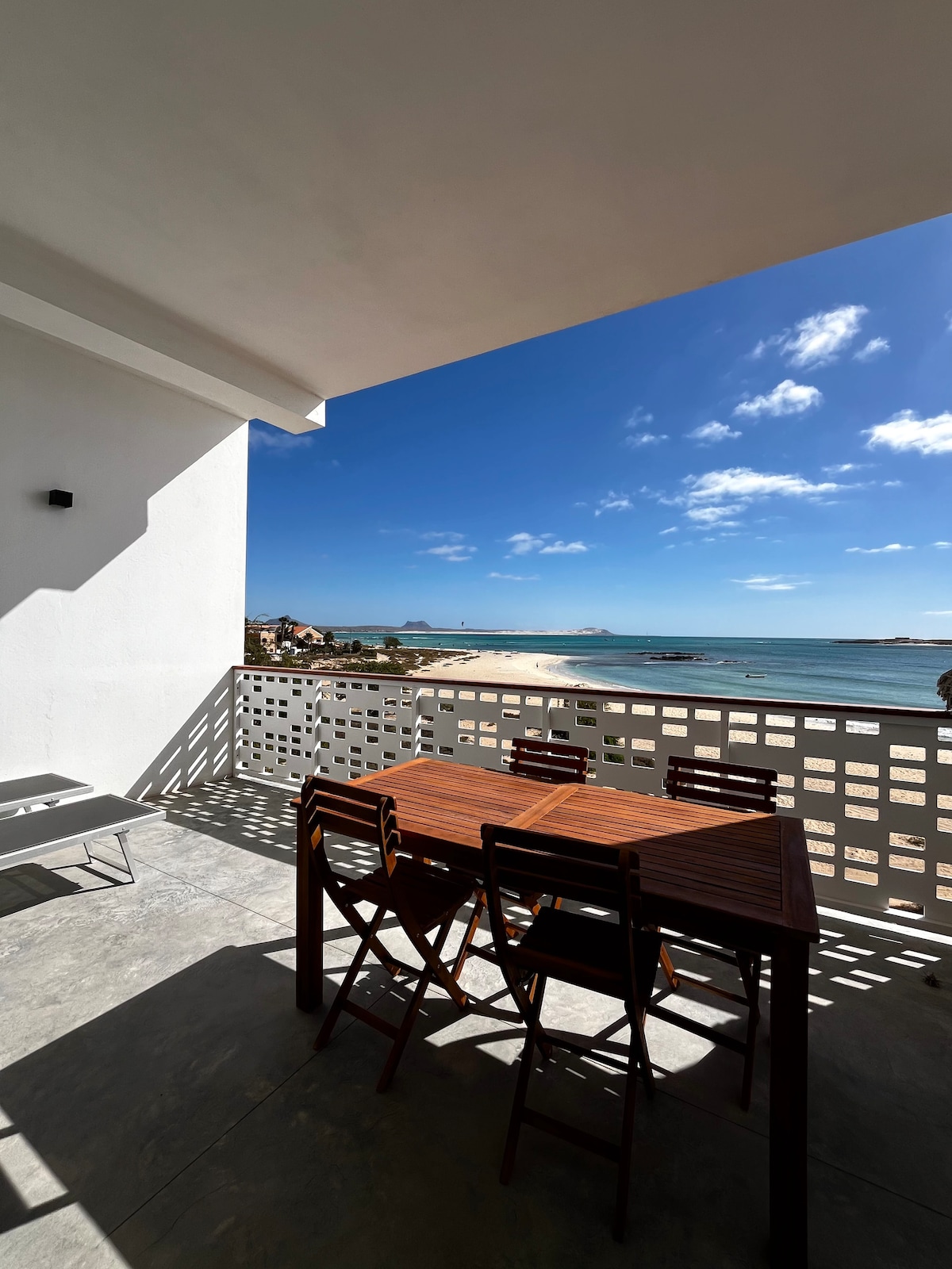 Spacious T2 apartment on the first floor featuring a double seafront veranda and amazing view on the bay of Sal Rei. The apartment features one master bedroom with en suite bathroom, private balcony and independent entrance and another double bedroom to the back. The living-kitchen area is generously spaced and fully equipped for the guests’ comfort. The 26 sqm veranda is facing directly on the bay of Sal Rei gifting it’s guests astonishing views of the sun setting behind the islet.