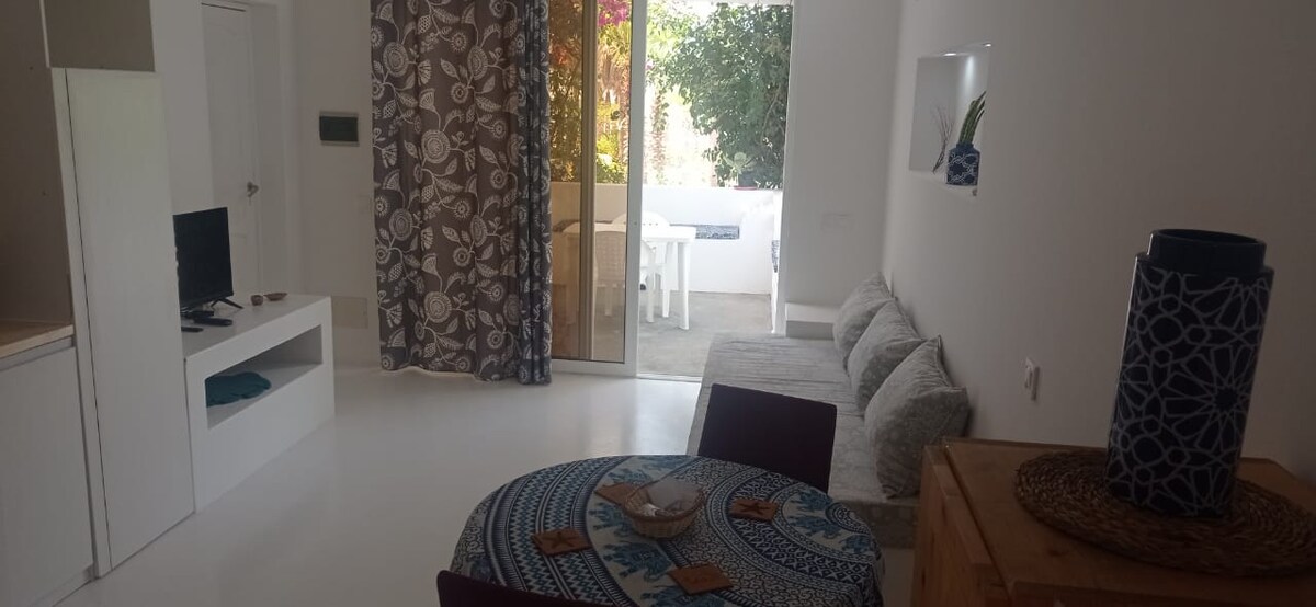 Apartment with double bed and 2 single beds, equipped kitchen, private bathroom, furnished patio and locally crafted furnishing elements. Perfect for couples and small groups of friends. A few steps from the center and 1 minute from the most beautiful beach on the island! Transfers to/from airport and excursion organization available. NB: water is a precious commodity, especially on a small island, therefore we require a surcharge of €15/t over the 2t/week included in the price.