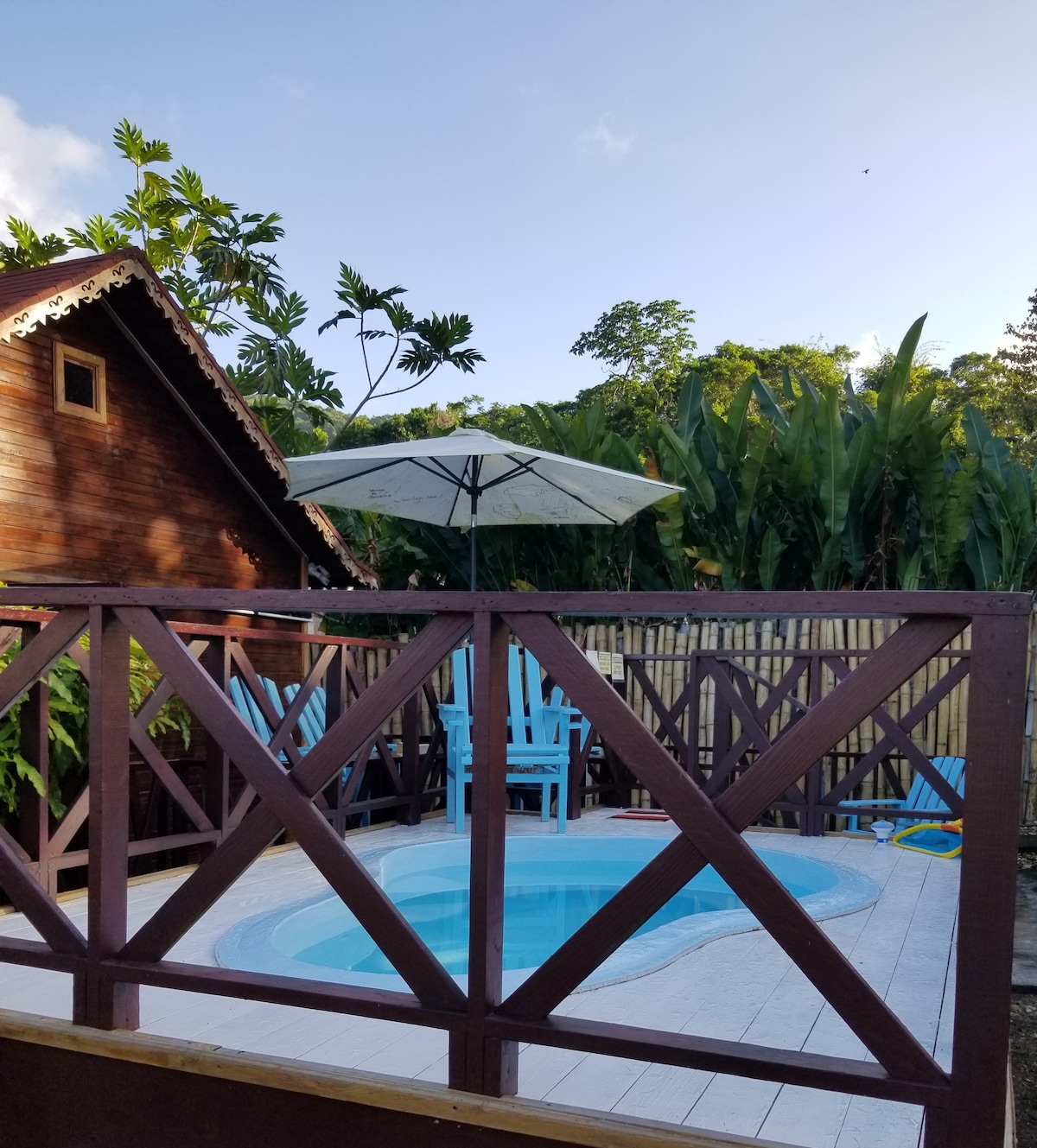 This is a one off a kind listing. A "Log-Cabin-Treehouse," built from the beautiful blue mahoe logs. This comfortable self contained studio is complete with ceiling fan, hot water and other essential amenities for the comfort of the nature and fun lovers. Located in a gated community with 24 hours security with access to swimming pool and tennis court. Come “chillax” unwind and bond with nature in our one-of-a-kind log cabin treehouse.