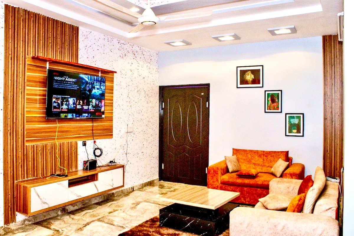 À moins de 10 min de l’aéroport, du centre-ville et à proximité de plusieurs commodités, la résidence est située sur une rue bitumée, éclairée au cœur d’un quartier résidentiel. Résidence moderne, très propre, cadre de vie haut de gamme, comprenant 2 salons spacieux et lumineux, 2 grandes chambres, 2 salles de toilettes, une cuisine avec garde-manger, buanderie et toilette externe. Pour vos cérémonies, vacances ou voyages d’affaires, profitez d’un jardin paysager, cours pavée, grande terrasse