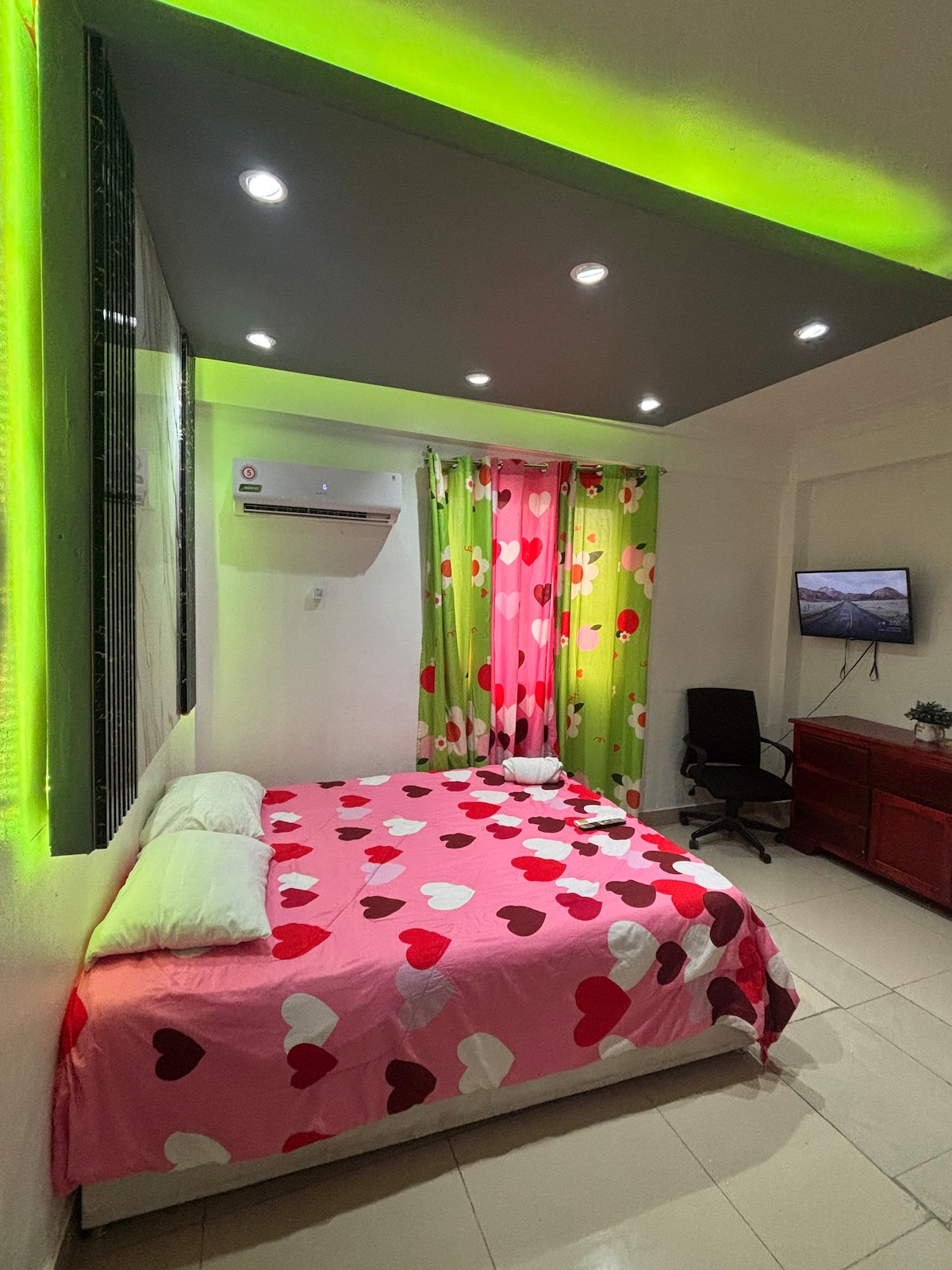Golden House, en la exclusiva zona de Santo Domingo Este, combina lujo moderno y una ubicación inmejorable. Relájate en su piscina, disfruta del desayuno incluido y vive momentos únicos en su terraza o elegante salón de eventos. Rodeado de tiendas, restaurantes y supermercados, es el lugar perfecto para parejas y familias que buscan comodidad, tranquilidad y un servicio excepcional. ¡Haz de tu estadía una experiencia inolvidable!