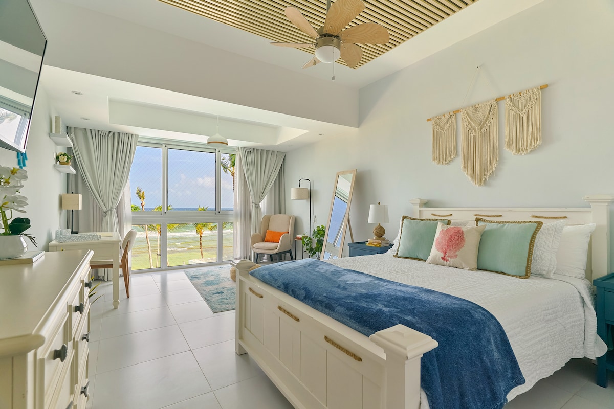 Located just feet from the beach, this 2 bedroom 2 bathroom condo has it all. Amazing views of the beach and ocean, central access to all the great parts of Boca Chica, short taxi downtown or SDQ airport! Plus all rooms have AC! Be careful because some say they have AC and that means just the master bedroom, this condo has 1 in each room including the living room! Please note that only street parking is available.