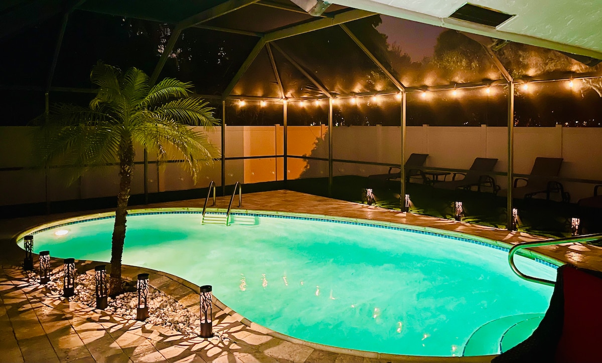 ⭐️RANKED TOP 10% OF HOMES ON AIRBNB 🌊Heated Salt Water Pool (85 degrees year round free of charge) 🌴2 bedrooms plus 3rd Game room with full size futon bed and lockable doors as a 3rd room 🚣Free Kayaks and Paddle boards right off the dock 🐠 70 ft Waterfront / FISH RIGHT OFF THE DOCK 🔥Tiki hut with fire pit & outdoor seating/ BBQ grill 🎯Gameroom 🏡 Fully remodeled home 📺TVs in each bedroom 🏝️Only 2.5 miles to beach! ⛱️Beach essentials included 🚘 4 parking spaces