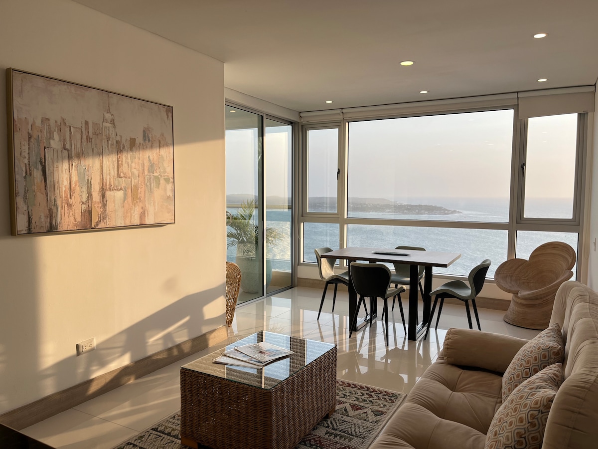 Exclusive 30th floor apartment Morros City with incredible and captivating sea and historic center views. Master bedroom with direct sea view and balcony access. Full kitchen, 2-in-1 washer and dryer, 60" Smart TV, 500MB fiber optic WiFi. Beachfront Bocagrande with luxury amenities: pool, jacuzzi, Turkish bath and gym. Free parking. Ideal for couples seeking the most exclusive experience from the highest available floor in all Cartagena