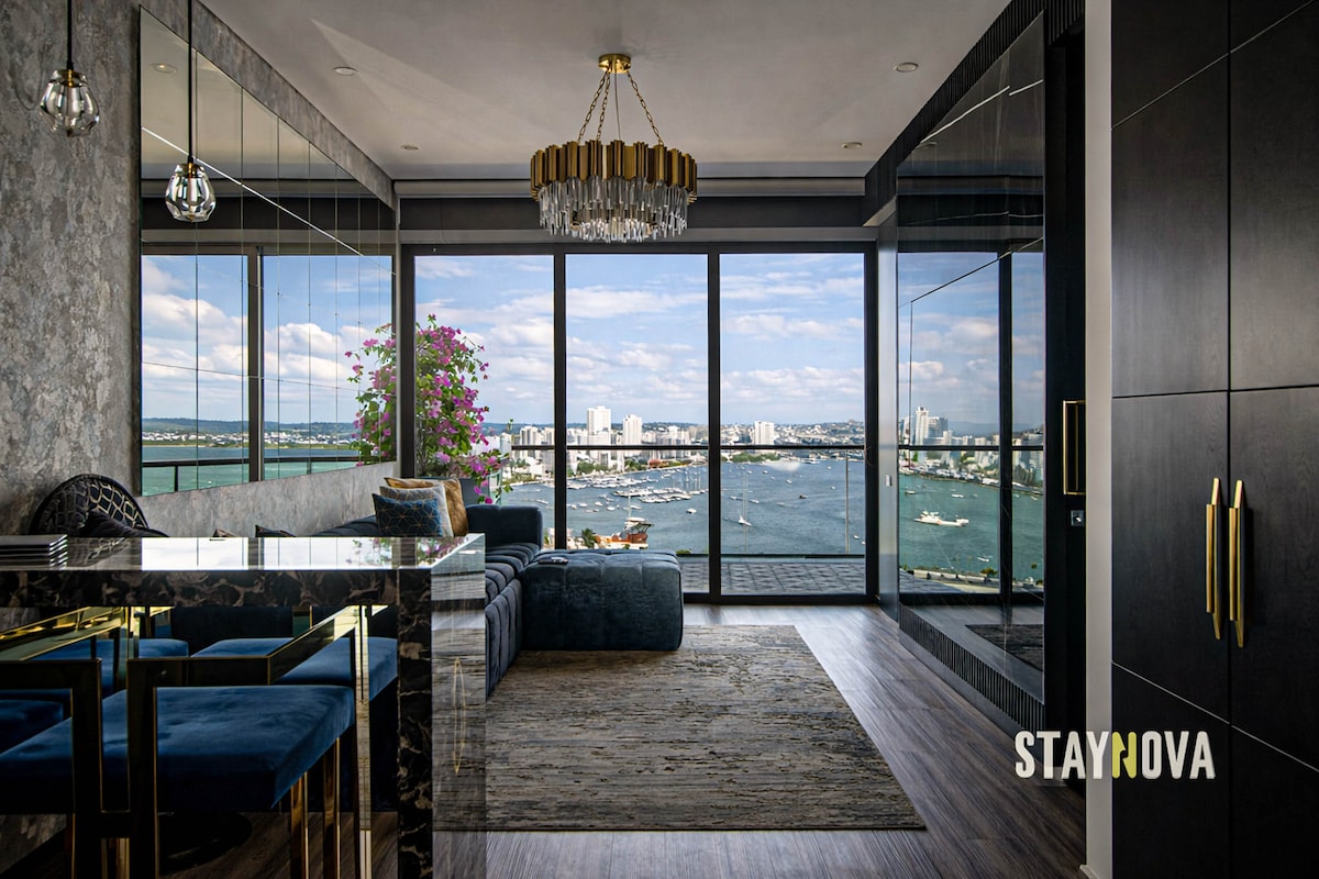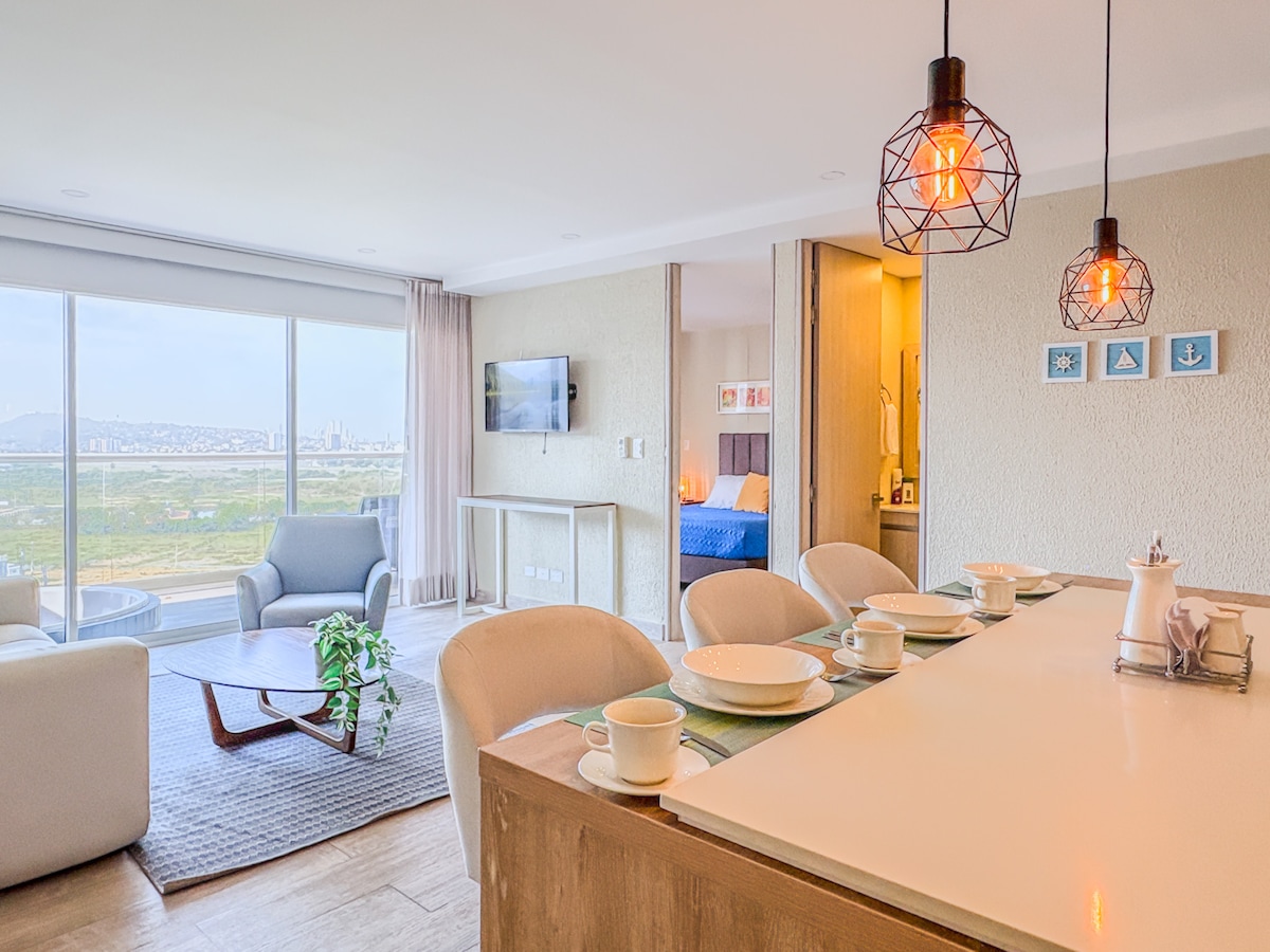 Our elegant apartment is located in one of the most complete and modern buildings in the exclusive "Cielo Mar" sector, a few meters from one of the best beaches in the city "Playa Azul", 10 minutes from the Historic Center and 5 minutes from the airport . . The apartment has an Extraordinary view of the Bay and the Ocean that you can enjoy from the private Jacuzzi on the balcony or in the incredible infinity pools on the Rooftop that have Jacuzzis, Sauna, Terrace Bar & BBQ