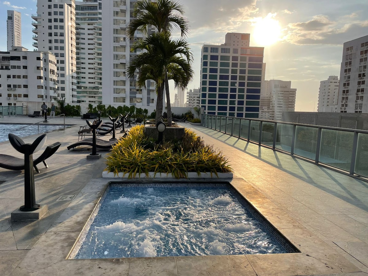 Confortable and luxurious apartment in a 33rd floor, with a stunning view of Cartagena's bay. Nearby restaurants, malls, supermarkets, a couple of blocks away from the beach and only 5 min away from Cartagena's historical center (by car). Equipped with brand new furniture and appliances, so that you feel at home. The building has a swimming pool, jacuzzi, gym, sauna, 4 elevators, parking and ping pong tables