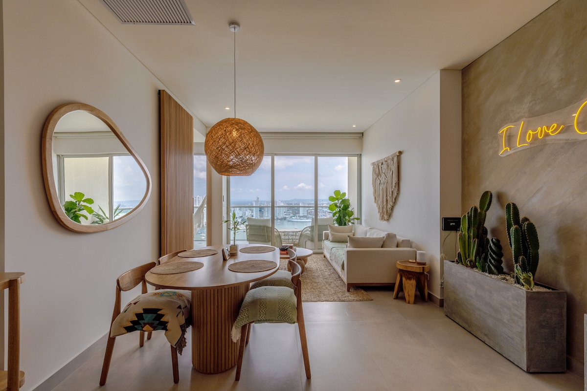 This apartment is perfect for couples looking for an exclusive place to stay, with everything within reach. It’s also suitable for older guests. The building is a residential tower located above a shopping center that has it all — supermarkets, restaurants, and stores. The apartment itself has an elegant style, thoughtfully designed down to the smallest detail. It's filled with Cartagena-inspired art and offers a spectacular view.