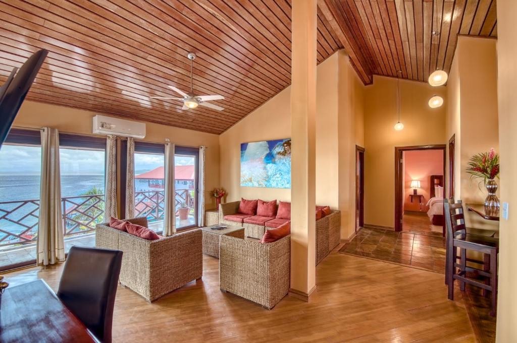 2 bedroom Penthouse suite with full kitchen and refrigerator/freezer and spacious living area a with two queen size beds, wrap around balcony with breathtaking sea views, 2 bathrooms with rain water showers, office desk, air conditioning, coffee pot with grinder and panamanian coffee beans, flat screen tv with cable, top floor, free wifi, large quality windows and doors, pillow top mattresses, marble or coral tile, non-smoking rooms, beach towels, blow dryers, laundry service, board games.