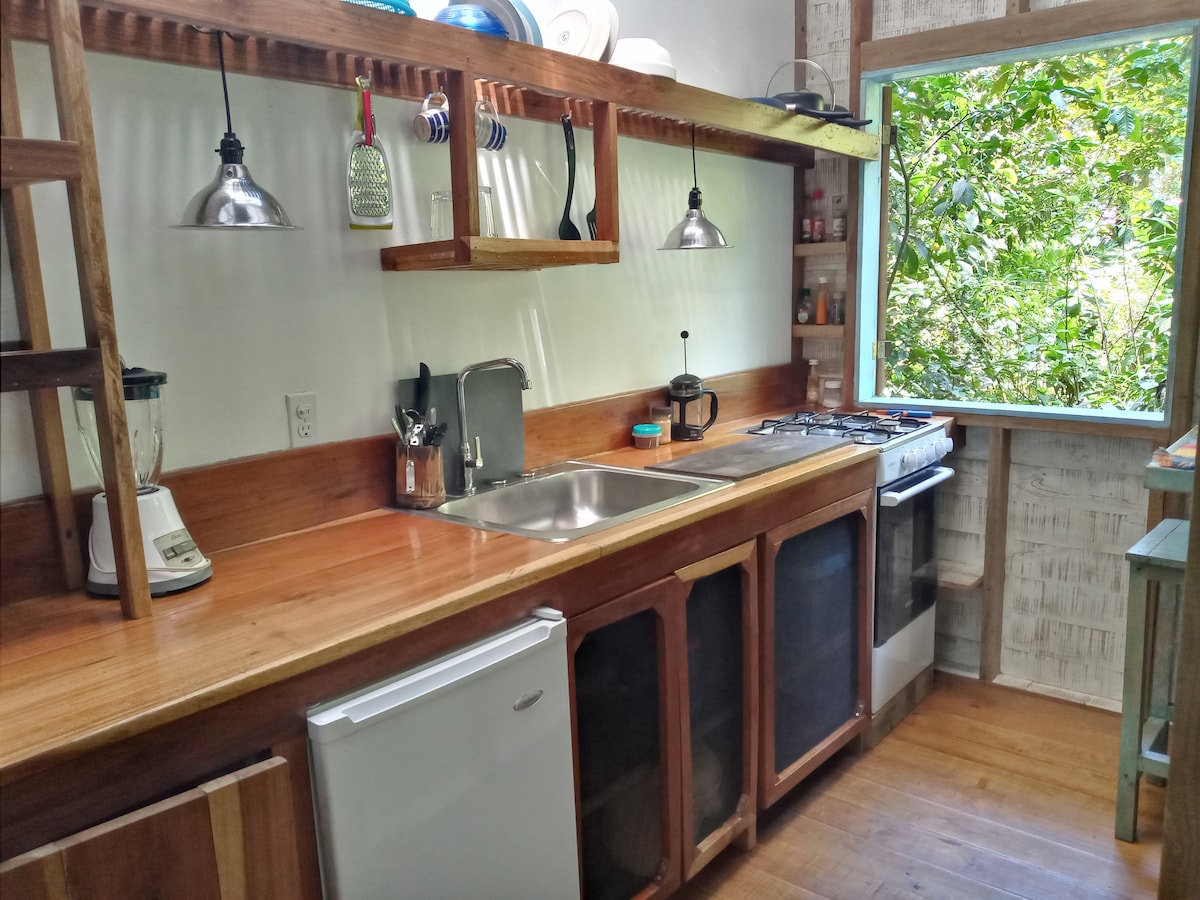 This modern style tiny home is located a beautiful jungle settings. Enjoy monkeys and birds from the comfort of your luxurious king size bed, sofa couch, or twin beds in our vaulted loft viewing and sleeping area. Escape the heat and bugs with our AC cooled indoor area. A screened kitchen with appliances to prepare almost any meal. And a great bathroom with private outdoor shower to truly enjoy nature. We have games, books, and a smart tv to keep you busy on those rainy days. Enjoy!