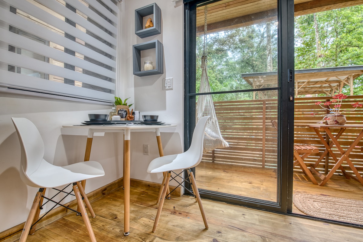 Relaxing get-away surrounded by nature, featuring an open-air kitchen & lounge below with creek view. Bedroom features TV, AC, mini-fridge, coffee maker, microwave, large closet area, two seating areas and a queen bed with memory foam mattress that looks out double set of sliding glass doors to large private balcony. The bathroom offers a touch of luxury with a large rain shower, eco toilet & two large sinks. All furniture is handmade by local artisans and our favorite plants are throughout.