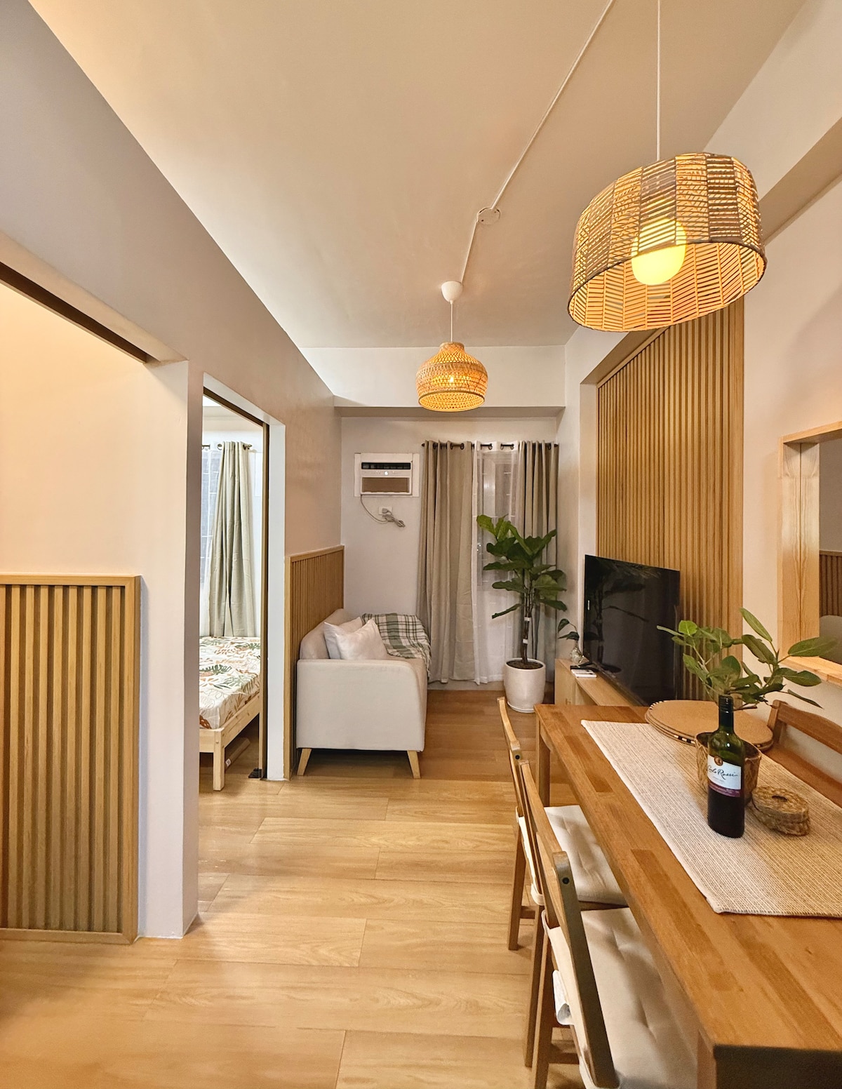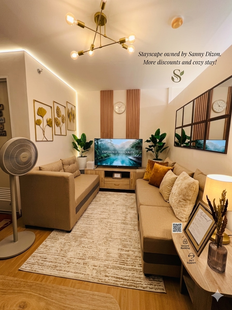 A cozy and comfortable studio unit located in the heart of SMDC Cheer Residences in Marilao, Bulacan! Our unit is fully furnished and equipped with everything you need for a comfortable and enjoyable stay, including a comfortable queen-sized bed, a sofa bed, a flat-screen TV, a dining table, a kitchenette with a refrigerator, microwave, electric kettle, and basic kitchenware, a private bathroom with a hot and cold shower, swimming pool, a 24-hour security and reception desk.