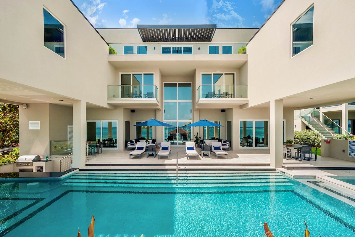 Waves come nearly up to the pool of this modern estate on Grand Cayman’s south coast. The pool runs the width of the house—parallel to the shore—and it’s framed by living and dining areas and an outdoor kitchen with a swim-up bar. Sculptural sofas and metallic accents lend a little glam to an open-plan great room. Dip toes on the beach in front or drive to beachside eateries in nearby Bodden Town. Copyright © Luxury Retreats. All rights reserved. BEDROOM & BATHROOM • Bedroom 1 - Primary: King size bed, Ensuite bathroom with 2 stand-alone showers & bathtub, Dual vanity, Walk-in closet, Television, Lounge area, Ceiling fan, Balcony, Ocean view • Bedroom 2: King size bed, Ensuite bathroom with shower/bathtub combo, Dual vanity, Television, Ceiling fan, Balcony, Ocean view • Bedroom 3: King size bed, Ensuite bathroom with shower/bathtub combo, Dual vanity, Television, Ceiling fan, Balcony, Ocean view • Bedroom 4: King size bed, Ensuite bathroom with stand-alone shower, Dual vanity, Television, Balcony, Ocean view • Bedroom 5: King size bed, Ensuite bathroom with stand-alone shower, Dual vanity, Television, Balcony, Ocean view • Bedroom 6: 2 Queen size beds, Ensuite bathroom with stand-alone shower, Television, Desk, Ceiling fan • Bedroom 7: 2 Double size bunk beds Ensuite bathroom with stand-alone shower, Television OUTDOOR FEATURES • View of Caribbean Sea • Outdoor living space • Garden STAFF & SERVICES Extra Cost (advance notice may be required): • Activities and excursions • Concierge service