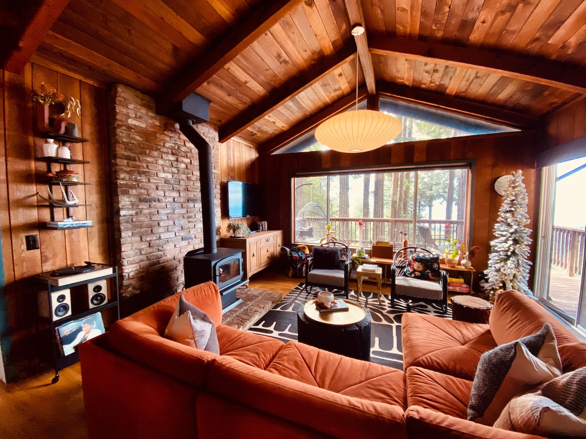 **Recently refreshed/re-furnished!** This house was named 'The Ranch House' by its architect Don Jacobs, this updated 70s cabin is a forest getaway with modern sensibility. The house is surrounded by redwoods & has 2 large decks, 1 w/ propane firepit w/ ample seating, the other w/ hot tub. Living room has picture windows w/ forest views & Morso wood-burning stove. Guests are encouraged to enjoy the hiking trails, pools, and outdoor amenities. House comfortably sleeps 4, plus fiber-optic internet