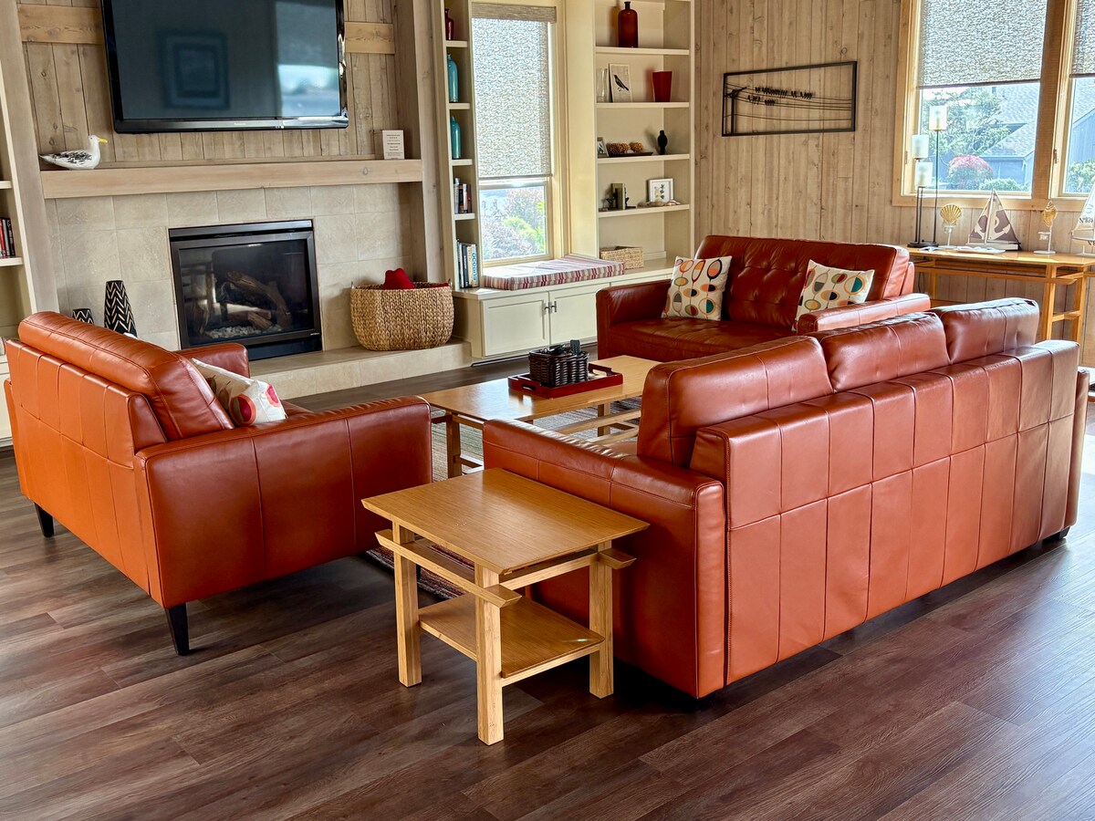 Our custom-designed beachhouse is perched on a bluff overlooking the Pacific Ocean and offers spectacular panoramic views from every room. It's a perfect retreat from everyday life. Relax in one of two living areas or on one of the decks, and toast the sunset with local wines. Walk along sandy Dillon Beach, hike to the estero, fish from the many coves, kayak, surf, paddleboard or kiteboard at the beach, eat oysters from the pristine Tomales Bay, or curl up with a book on the couch.