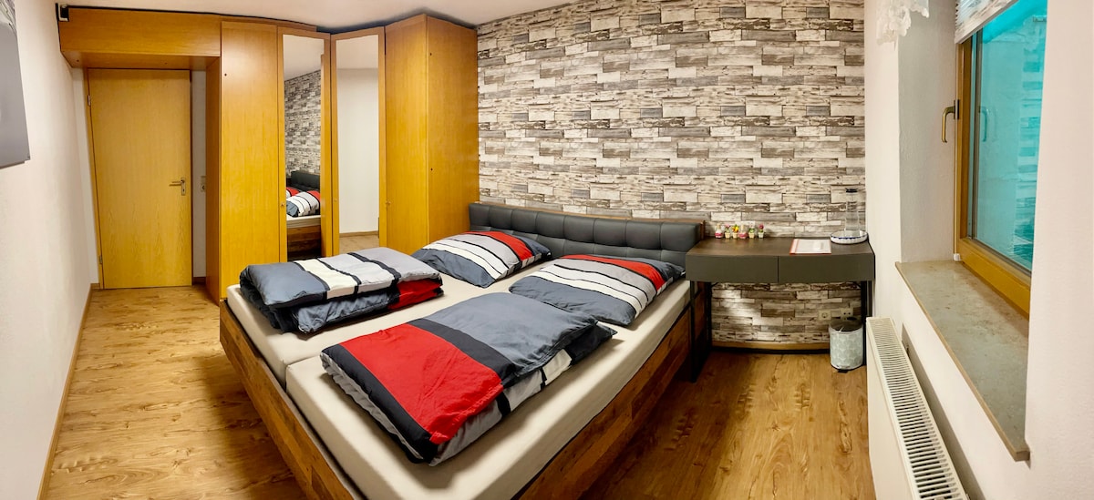 Reihenhaus mit sehr grosszügigem Raumangebot auf 3 Etagen, ideal für Familien und grosse Gruppen. Insgesamt sind 15 Schlafplätze vorhanden, aufgeteilt auf 1 Doppelbett, 13 kombinierbare Einzelbetten, sowie 3 Badezimmer, die je nach Gruppengrösse freigegeben werden. Föhn, Waschmaschine & Trockner, sowie Stauraum für das Gepäck sind so oder so immer mit dabei. Zum Haus gehören 2 Parkplätze direkt neben dem grossen Garten. Die Nähe zu Deutschland, wie zum Bodensee/Rhein, runden den Aufenthalt ab.