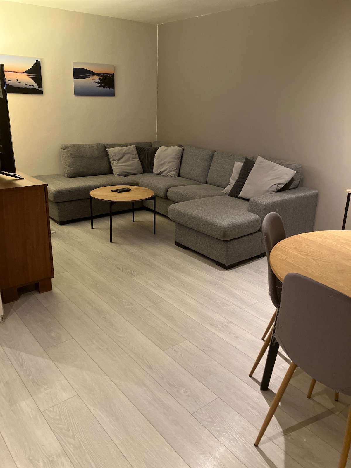Leilighet i 1.et med egen parkeringsplass nært leiligheten. Fint terrasse med sittegruppe ute. Leiligheten har 2 soverom med dobbeltseng og bad med stor dusj. Leiligheten ligger rett ved busstoppet og koster 38kr ned til sendtrum-tar ca 10min med buss og ca 30min å gå ned. Ca 20 min å gå ned til nærmeste kjøpesenter. Nydelige turområder rett ut døren. Lokal matbutikk rett ved siden av. Lite støy fra andre leiligheter og ingen trafikkstøy.0min i bil/taxi til flyplass og sentrum 1stk sykkel