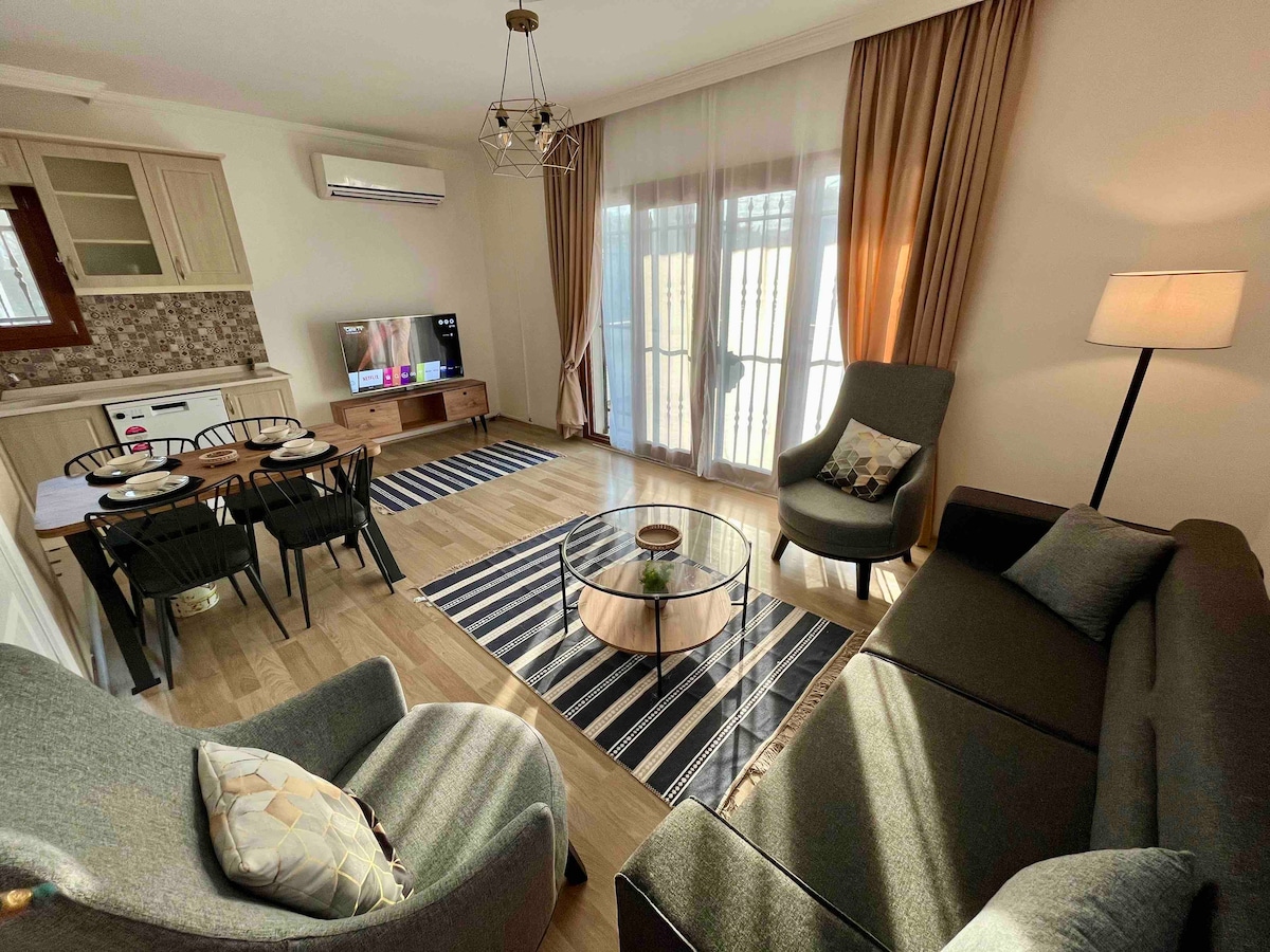 My modern decorated apartment is perfectly located on a scenic hill only 1 km away from Bodrum Centre. Fully furnished and has a common pool.I will be happy to welcome you in my apartment within a gated residence and 24 hour security.