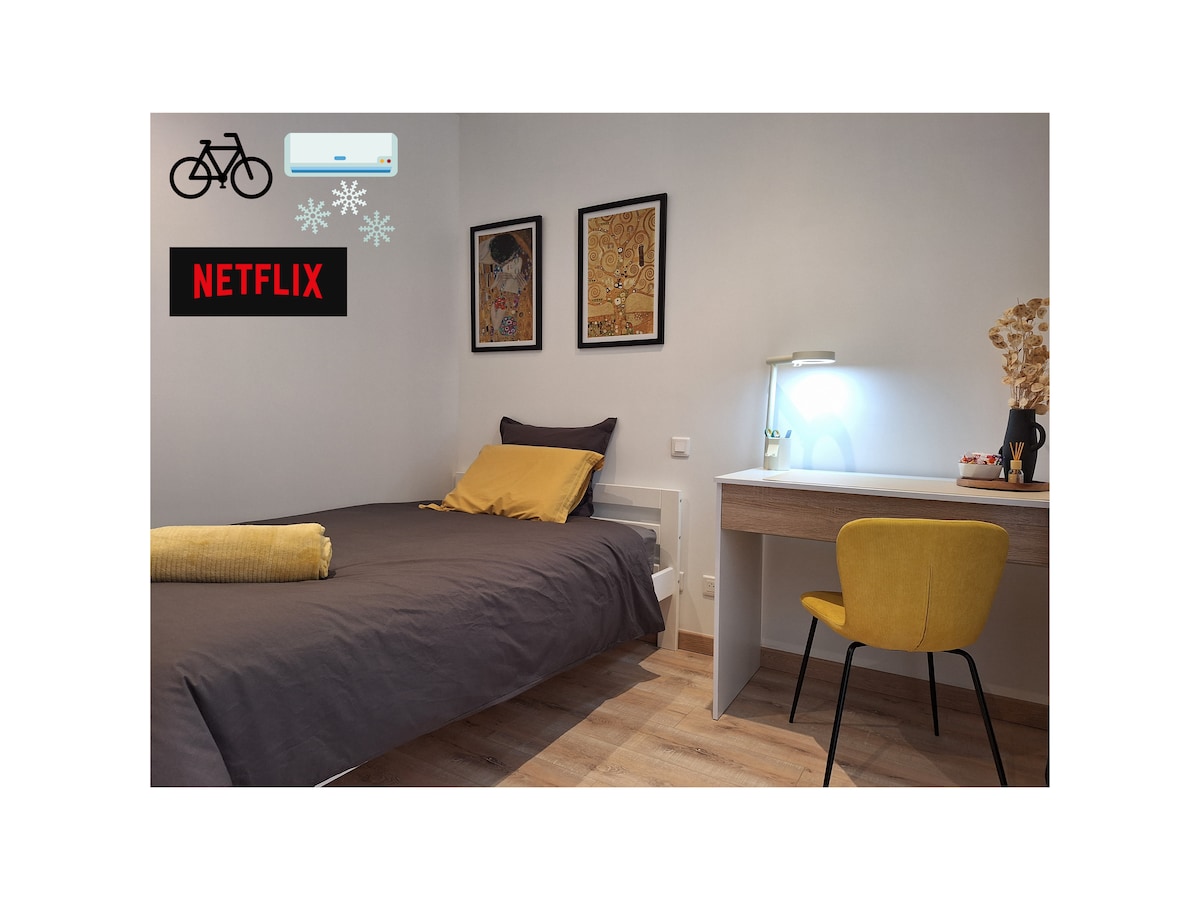 Tout le RDC de ma maison avec terrasse, jardin, piscine, bbq avec ses 2 entrées indépendantes exclusives ! - Chambre double - literie allemande 160X200 + banquette. - Séjour ou ch. double - Lit de 140 x 190 cm. Douche à l'italienne - Wc séparés. PAS de cuisine MAIS bouilloire, réfrigérateur-congélateur, micro-ondes, lave-vaisselle (la nouveauté sept 2025 !) Forfait € 15 pour le linge à régler à l'arrivée. Piscine partagée avec la propriétaire. Ambiance chaleureuse : "à la bonne franquette".