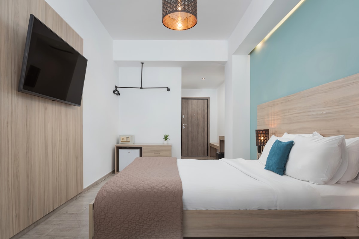 Suite 201 is ready to welcome you to a bright, comfortable, and newly renovated room overlooking the Athens City Hall. It features a fully equipped kitchen, a modern bathroom with a smart mirror, a king-size bed, a 65" TV, Starlink Wi-Fi, A/C, and electric blackout curtains. With a cozy armchair-bed, a desk, and plenty of storage space, it offers a stylish and relaxing stay in the heart of the city. Just 300 meters (4 min. walk) from the metro, you can explore Athens quickly and easily.