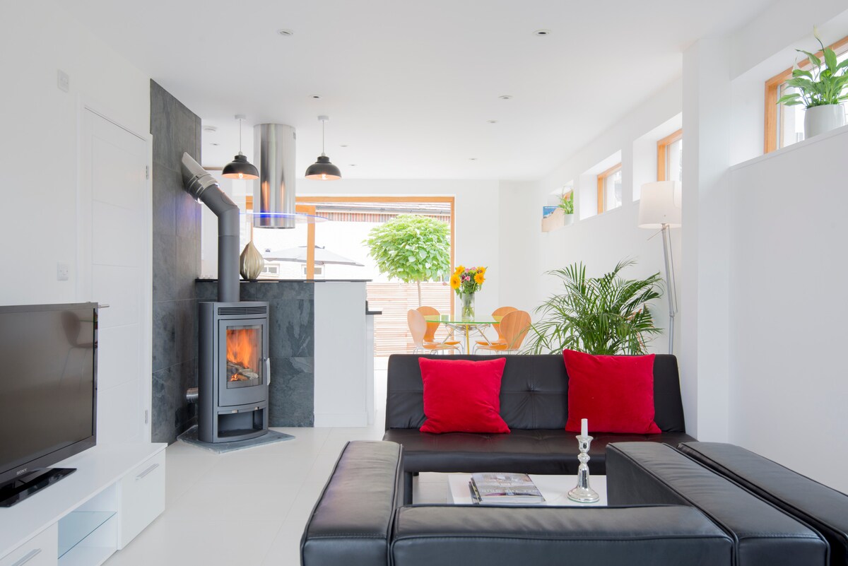 As the architect and developer I was pleased to receive several awards for my 2 bedroom Eco house and garden. Sleeps 4-with luxury toiletries on arrival. Uniquely located within an easy stroll of the Cathedral city’s genteel shopping, historical sites and acclaimed Festival Theater, yet tucked away to enjoy the field view opposite. The beach is just 20 mins drive plus gorgeous walks and pubs along with an abundance of family activities and romantic spots. Ideal for Goodwood-revival/festival