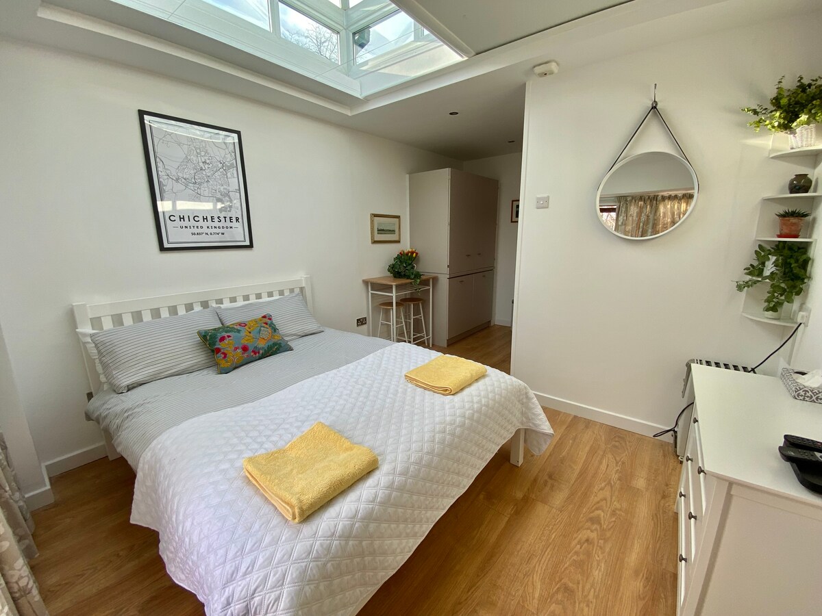 Lovely self-contained, light, airy and large (30m2) room just a 1 min walk from the beach. Own entrance, parking on driveway in front of front doors. A king size bed, sofa, basic kitchenette, dining table, en-suite bathroom (bath/shower) and a small private decked area. We welcome small & medium sized well behaved dogs. You can enjoy walking along the beach or join in the Goodwood fun. The room is part of the main family house &under bedrooms so noise from the family will be heard .
