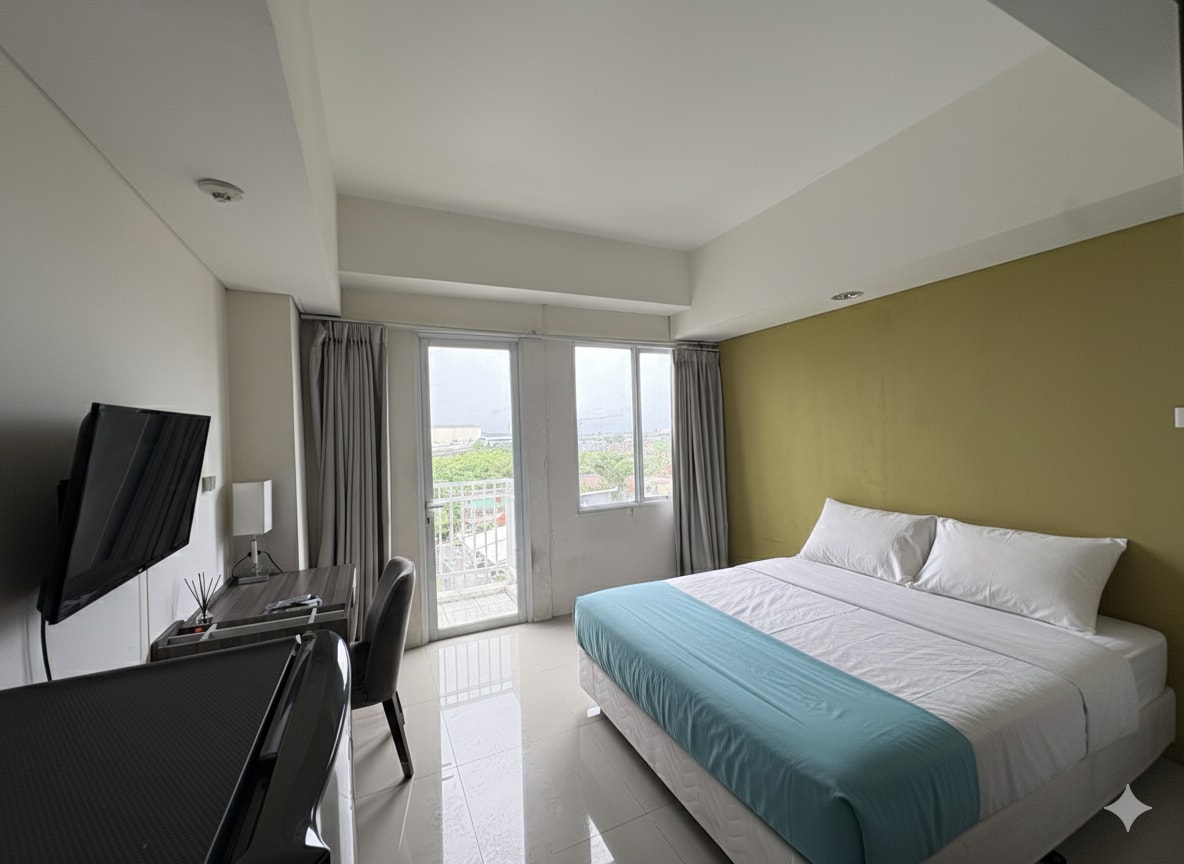 Nikmati kondisi kamar dan ruangan keseluruham yang nyaman yang didominasi warna sejuk dan natural. Sangat cocok untuk traveler yang ingin.merasakan suasana rumah yang nyaman tanpa.kehilangan semangat yang kuat. Kondisi kamar dan tambahan kitchen set dengan appliances akan.memudahkan pengunjung menikmati waktu istirahatnya setiap hari. Sebagai cara melepas lelah setelah selesai dari aktifitas formal. Pada saat jenuh dengan suasana kamar yang terbatas, pengunjung dapat memandang dari balkon kamar.