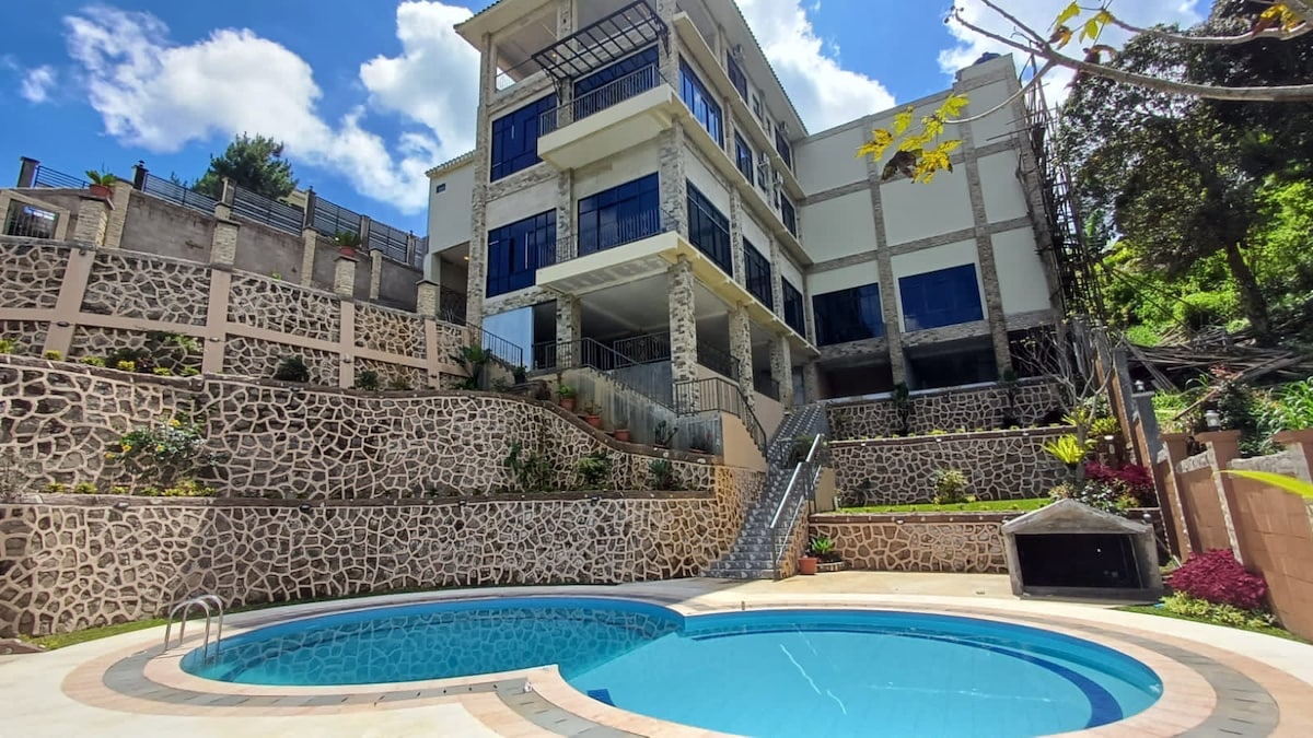 A spacious alpine-style villa made of pine wood, offering breathtaking views of Mt. Salak and Mt. Pangrango. The villa features a large main hall with one bedroom and two bungalows, each with two bedrooms, totaling five bedrooms. Enjoy the expansive space and the stunning natural surroundings. Relax in the swimming pool, filled with fresh mountain spring water. Perfect for those seeking a tranquil escape in a unique, nature-inspired setting.