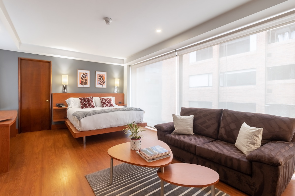Luxury one bedroom in the most exclusive / safe area of Bogota (Chico) within walking distance from the best restaurants, shopping centers and close proximity to many businesses. Executive level accommodation with dedicated workspace, private terrace, automatic fireplace, reliable WiFi, private parking and building security. Ameneties: Enjoy the beautiful panoramic terrace with fireplace and outdoor grill. Also play squash and relax in the sauna or steam room.