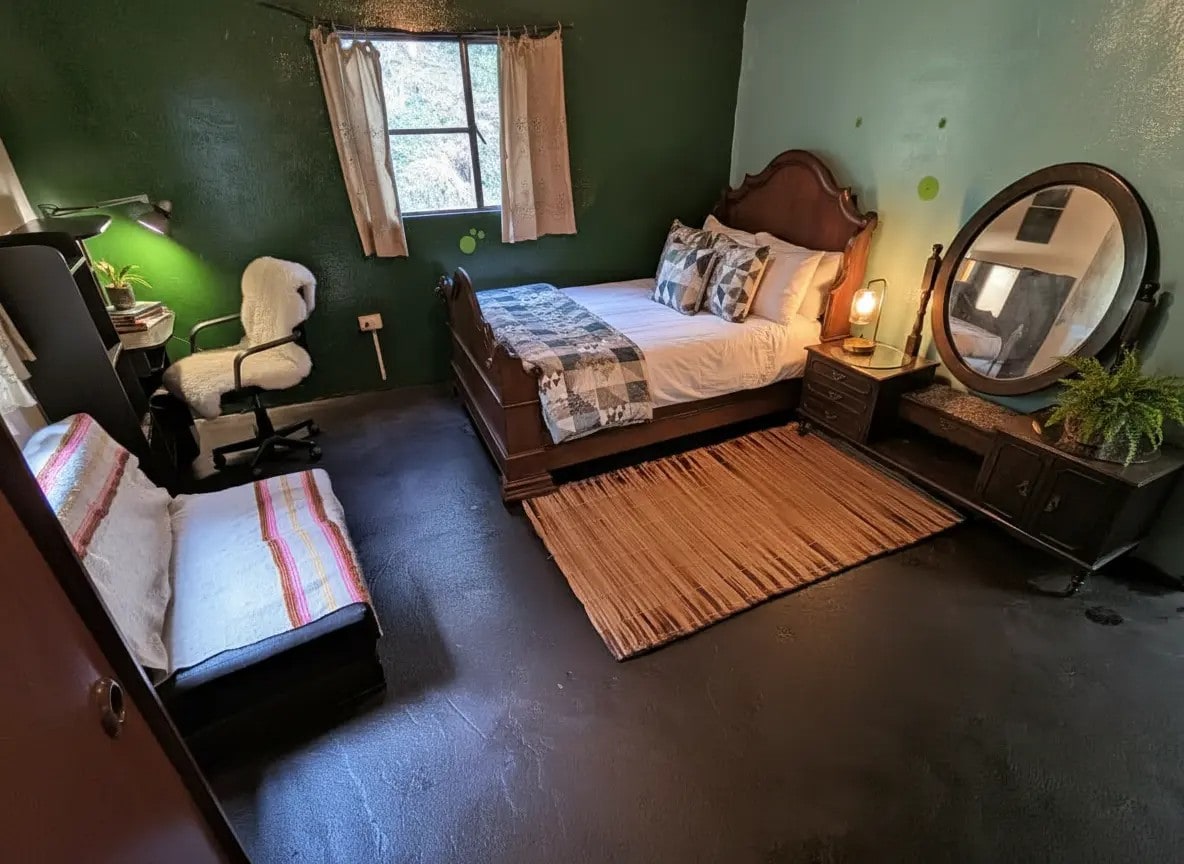 Apartaestudio familiar, pequeño, de un sólo ambiente, con baño privado y cocineta. Con una cama doble. Con la mejor vista de Bogotá, en casa tipo campestre. Ubicado a tres cuadras del centro histórico, con panorámica de la ciudad y los nevados. con nevera para todos los huéspedes de los apartaestudios, con huerta, con más de 15 plantas aromáticas para tomar infusiones o te, frutales como lulo, tomate de árbol, feijoa, mora, breva y uchuva y papa y cebolla. Un remanso de paz.