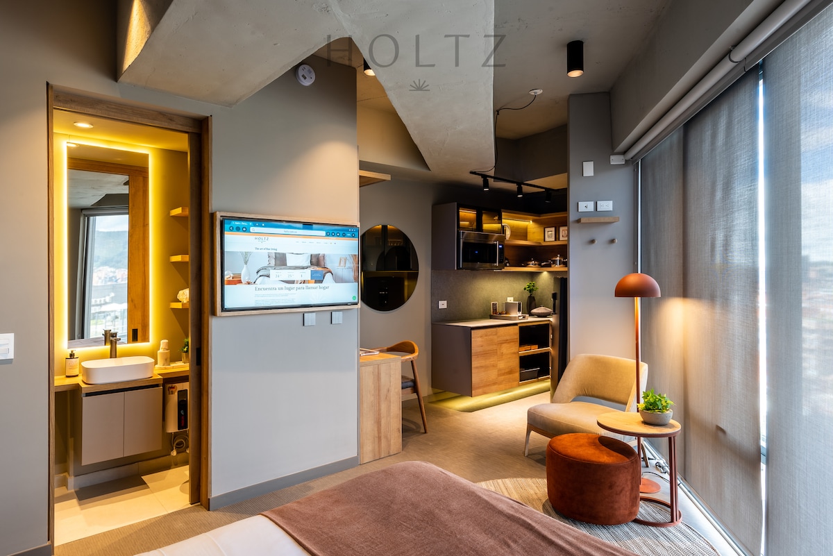 Vive Bogotá desde las alturas Disfruta nuestro elegante apartamento en el corazón de Chapinero, en el edificio más icónico de la zona. Su diseño de urna de vidrio ofrece vistas únicas de los Cerros Orientales, el Parque de los Hippies y la Carrera 7. Ideal para estancias cortas o largas, combina confort, estilo y ubicación privilegiada. A pocos pasos te espera la mejor escena gastronómica: restaurantes de autor, cafés de especialidad y bares llenos de vida.