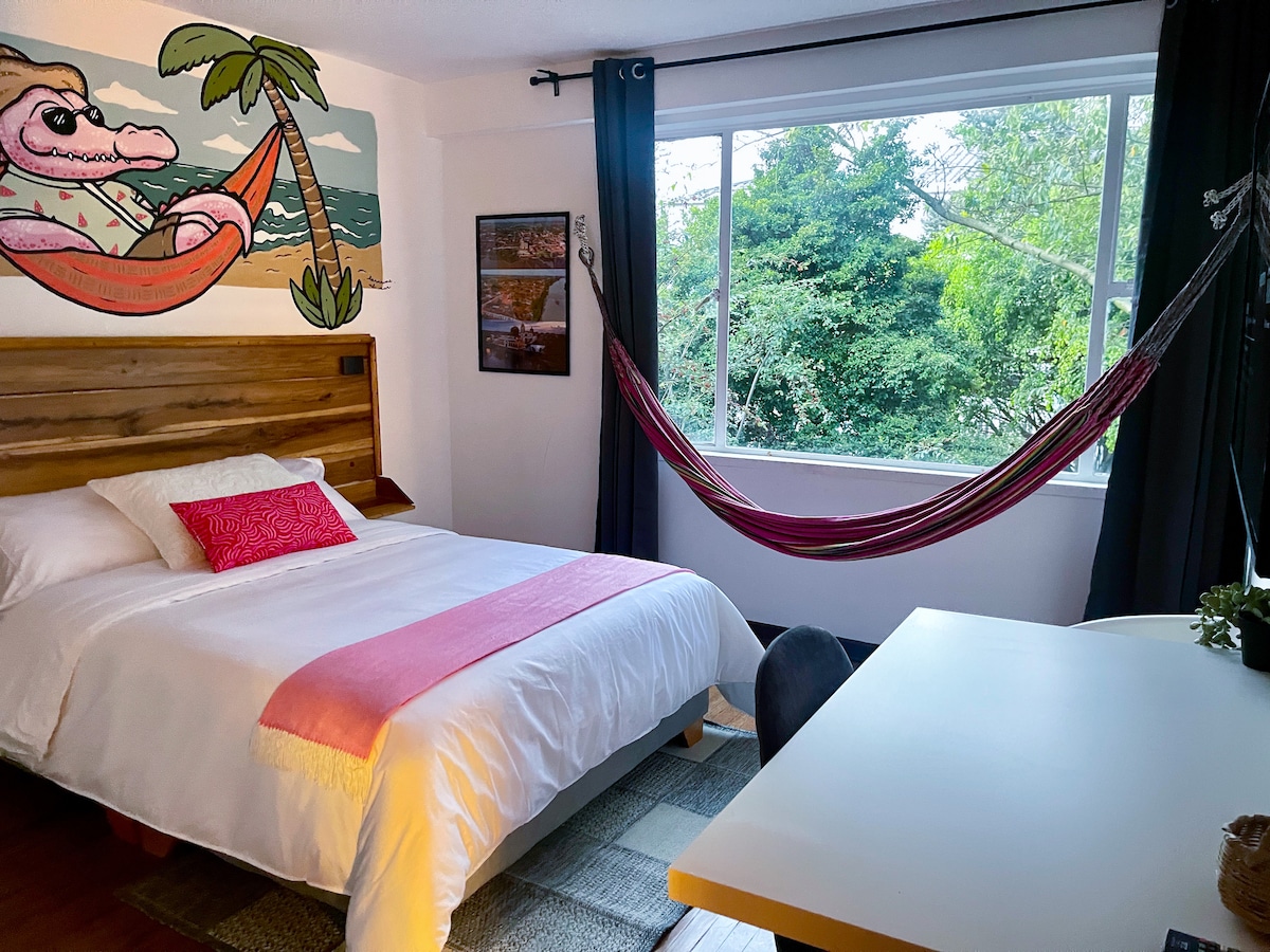 Introducing Red House: A private, independent duplex studio of 34m² in the heart of Bogotá: Modelia. Located facing a park (perfect for pets). Close to El Dorado Airport (10 min), U.S. Embassy, Monserrate (15 min), gastrobars, supermarkets, and banks. Equipped with WiFi 5G, N-TV, kitchen, washer-dryer, and covered parking. Early arrival or late departure? No worries, we’ll adjust the check-in/out. Book now!