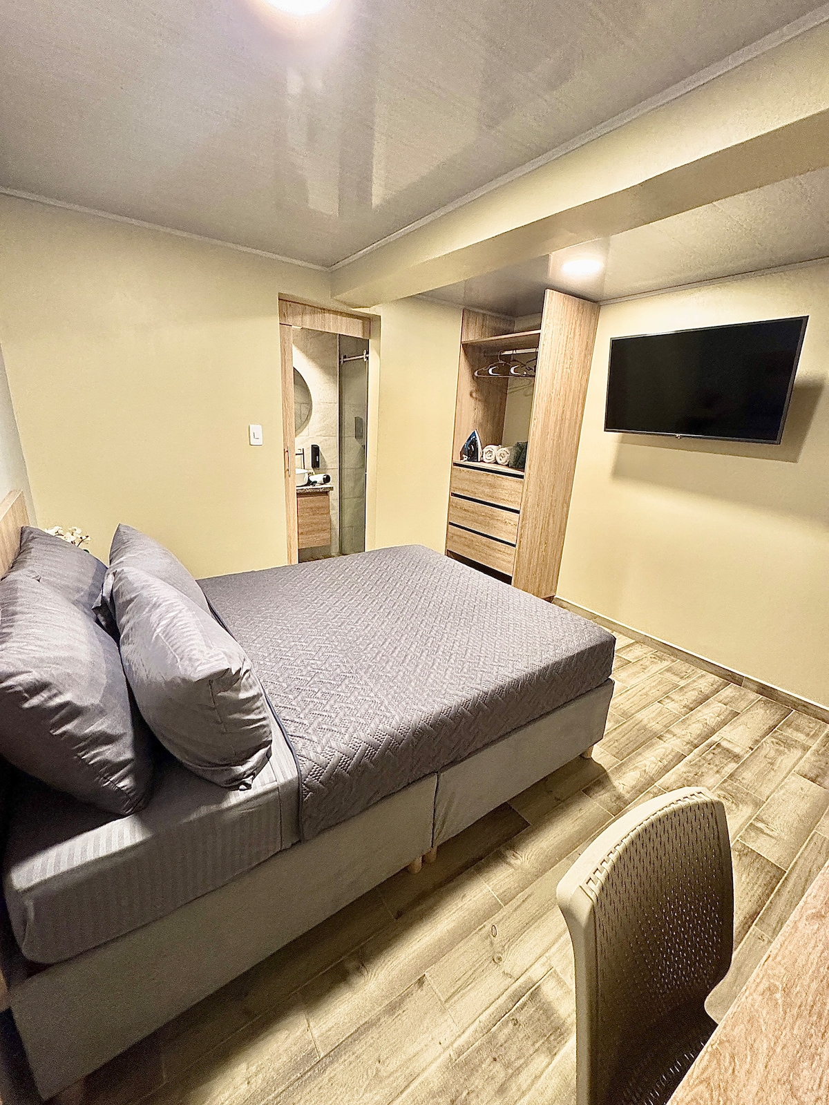 Este acogedor apartaestudio es de uso exclusivo, independiente y privado consta de una habitación amplia, con una cama doble, TV, clóset y mesa de escritorio, baño con agua caliente y una cocineta con nevera la cual tiene lo necesario para cocinar como ollas, loza, cubiertos y otros adicionales. El apartaestudio se encuentra ubicado en la parte de atras de la casa principal, por lo que la entrada es compartida entre ambos. El apartaestudio tiene una buena iluminación, es muy limpio y acogedor