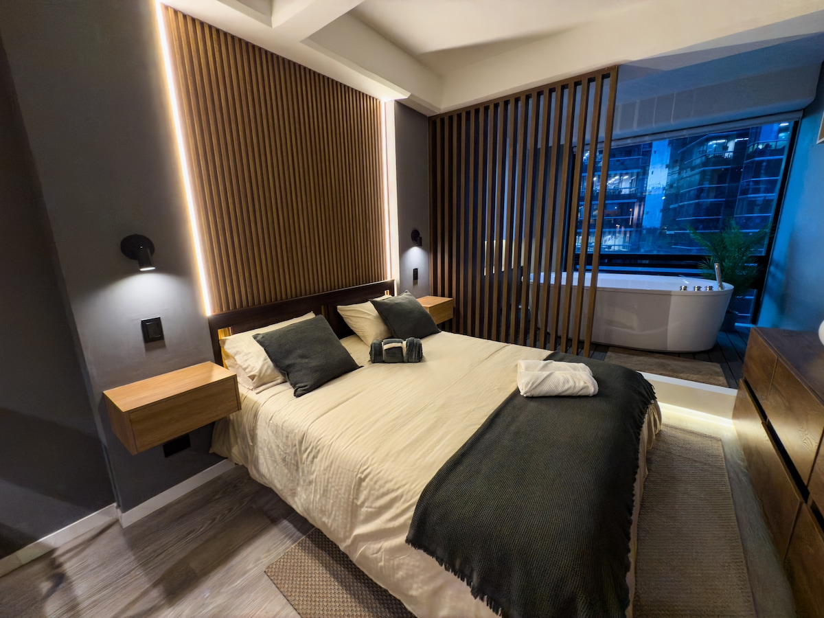 Welcome to a stylish and centrally-located place! Gorgeous 15th floor apartment with an UNBEATABLE VIEW. Our building offers top-of-the-line amenities, including an indoor pool, sauna, spa room, gym, terrace, bar, and rooftop restaurant. You'll feel like you're staying in a hotel with the convenience of an Airbnb. Close to Parque 93, you'll have the opportunity to experience local and international cuisine from some of the best restaurants in the city.
