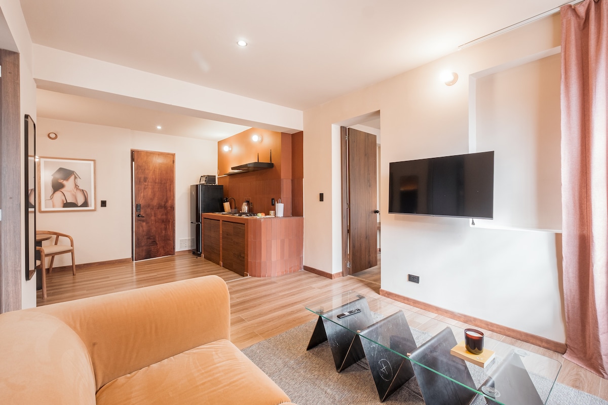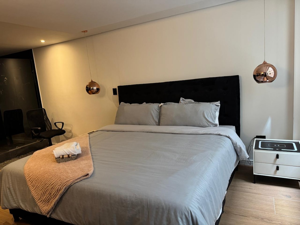 Moderno loft de 30 m² en Carrera 13 #85-87, Bogotá. Cama King, TV de 50”, zona de trabajo, baño moderno y cocineta equipada. Incluye blackout automatizado, cargador inalámbrico y detalles tecnológicos para una estadía cómoda y funcional.